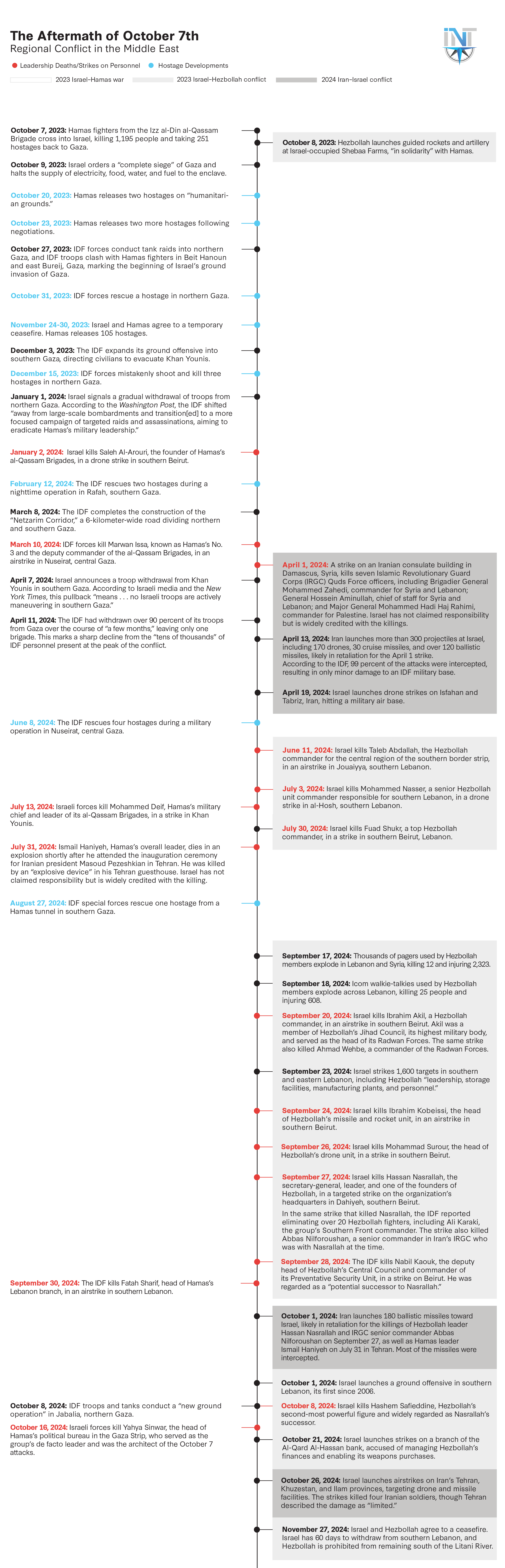 This timeline highlights how Israel focused its efforts and activities in Gaza at the start of the war (from October 2023 to January 2024), then gradually shifted resources toward Lebanon during the summer and fall of 2024, with devastating effects for Hezbollah. By dividing the two theaters, seen on the left- and right-hand sides, the timeline visually illustrates how Israel adjusted its focus over time, with early activity concentrated on the top left side (Israel-Hamas war) and a spike in activity appearing in the middle and end on the right side (Israel–Hezbollah conflict). Israel’s exchanges with Iran are also interspersed on the right side (Iran–Israel conflict). Although the timeline ends with the November 27, 2024, ceasefire between Israel and Hezbollah, it provides a rough overview of significant events from the past year of conflict.