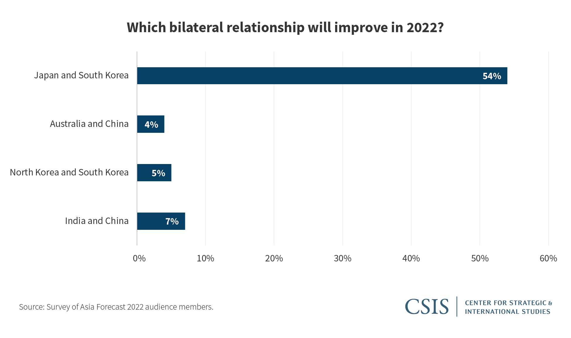 Both CSIS experts and the audience agreed that Japan-South Korea relations will improve in 2022. Cha pointed out that there is an appetite in South Korea to improve relations with Japan, exemplified by Governor Jae-myung Lee projecting a more positive outlook compared to earlier in the race. In addition, the Moon administration has reconfirmed the 2015 comfort women agreement between Japan and South Korea, and the South Korean supreme court has dismissed cases about comfort women and forced labor, potentially providing a foundation for improved relations. Yuko Nakano also noted that Japanese leaders understand it is in their nation’s interest to cooperate bilaterally with South Korea, and trilaterally with the United States, to address rising security concerns from China and North Korea. However, both Cha and Nakano anticipate that improving relations will depend on the domestic political environment and public opinion in both countries.