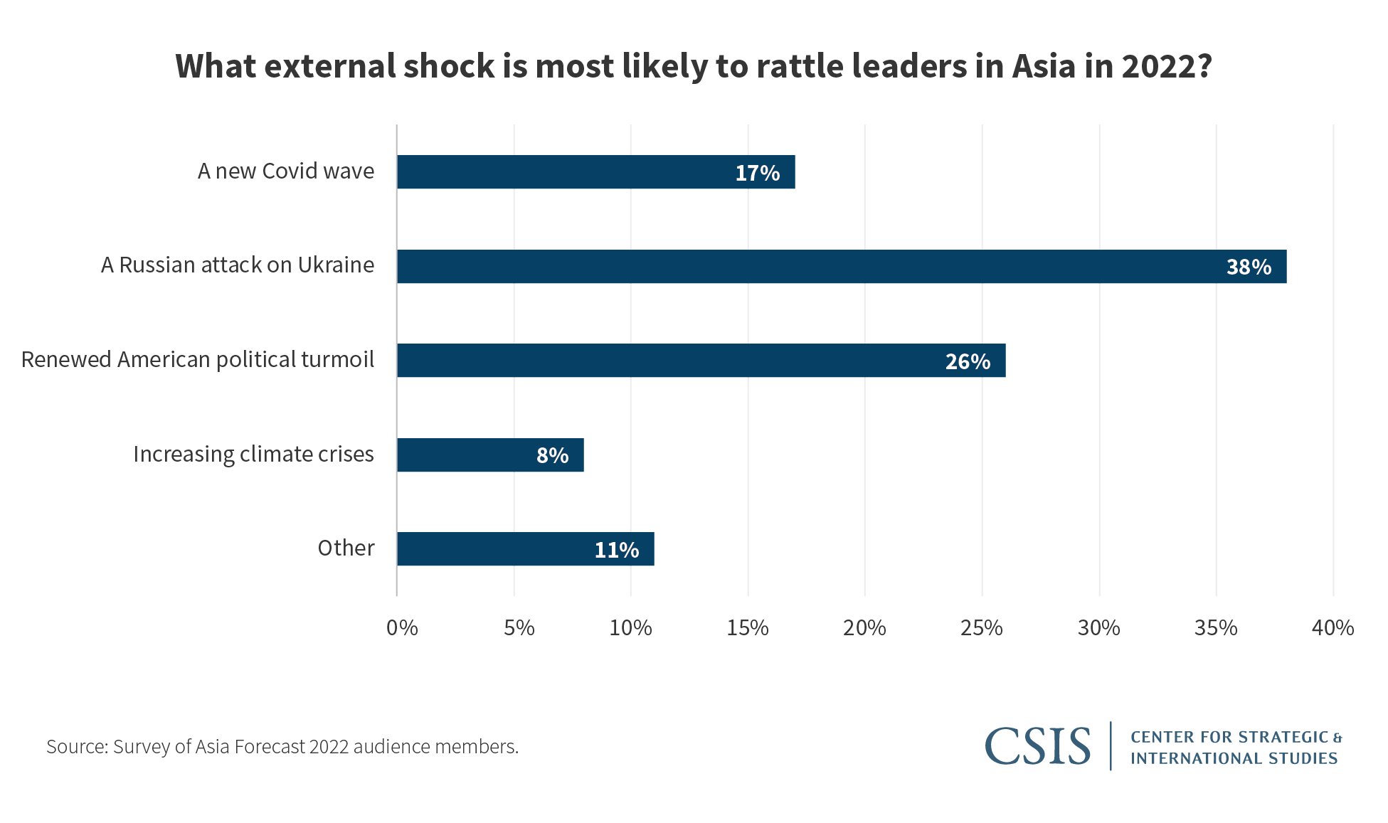 For the past 10 years, CSIS has brought together its leading experts on Asian politics, security, economics, and trade to provide annual previews of developments across the region in an event known as “Asia Forecast.” Panelists explore key questions about the trajectory of the region by surveying the audience in an interactive format designed to stimulate dialogue on current events. The following commentary highlights key predictions from this year’s Asia Forecast held virtually on January 27, 2022.