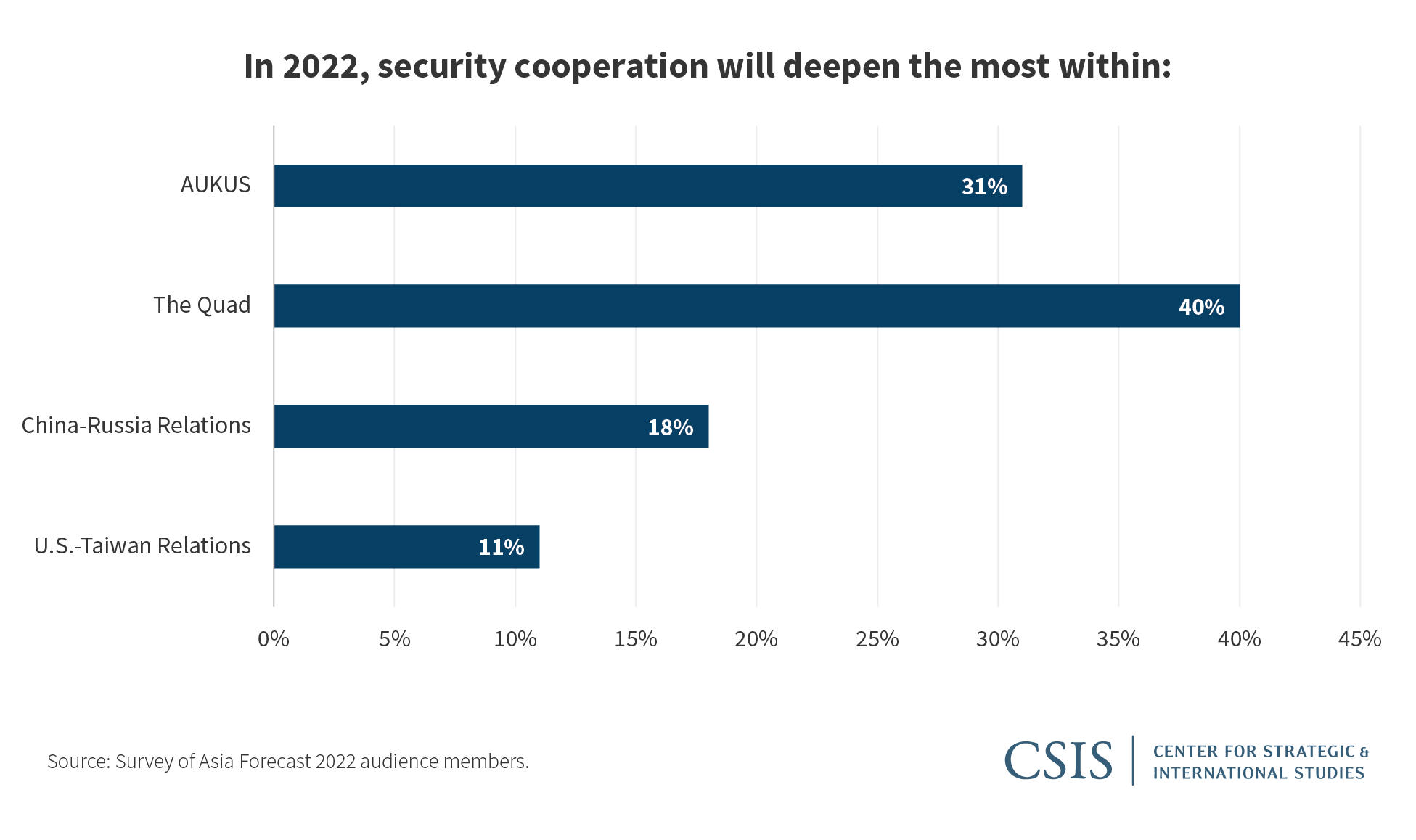 A plurality of respondents predict the United States, Japan, Australia, and India will accelerate security cooperation under the Quad construct this year. Nicholas Szechenyi observed that election of the Quad to a leaders’-level dialogue and the likelihood of a second in-person gathering in Japan this spring could produce concrete initiatives on security, but Poling noted that there is not much evidence to suggest India is willing to deepen security cooperation specifically. Lin and Poling, together with 31 percent of the audience, expect deepened security cooperation between the United States, Australia, and the United Kingdom under the new AUKUS agreement to demonstrate that AUKUS is about much more than the submarine deal and should become a robust framework for military cooperation. While some in the audience believed security cooperation between China and Russia will deepen in light of increased joint military exercises, Lin expects the relationship to grow incrementally with no concrete objectives compared to AUKUS or the Quad.