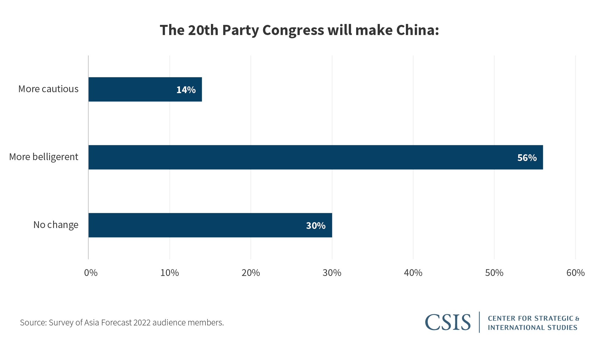 A majority of participants predicted that China will become more belligerent after the 20th Party Congress this year. Lin pointed out that Xi Jinping has a greater tolerance for risk than his predecessors and will pursue an even more aggressive foreign policy after he secures a third term and consolidates his power. Poling also expects increased belligerence under the assumption that the Chinese Communist Party (CCP) will reinforce Xi’s nationalistic behavior. Regarding other developments at the 20th Party Congress, Blanchette and Lin expect new additions to the CCP’s Taiwan policy, with Lin observing that new language from China points to more specific discussion on what will happen post-reunification.