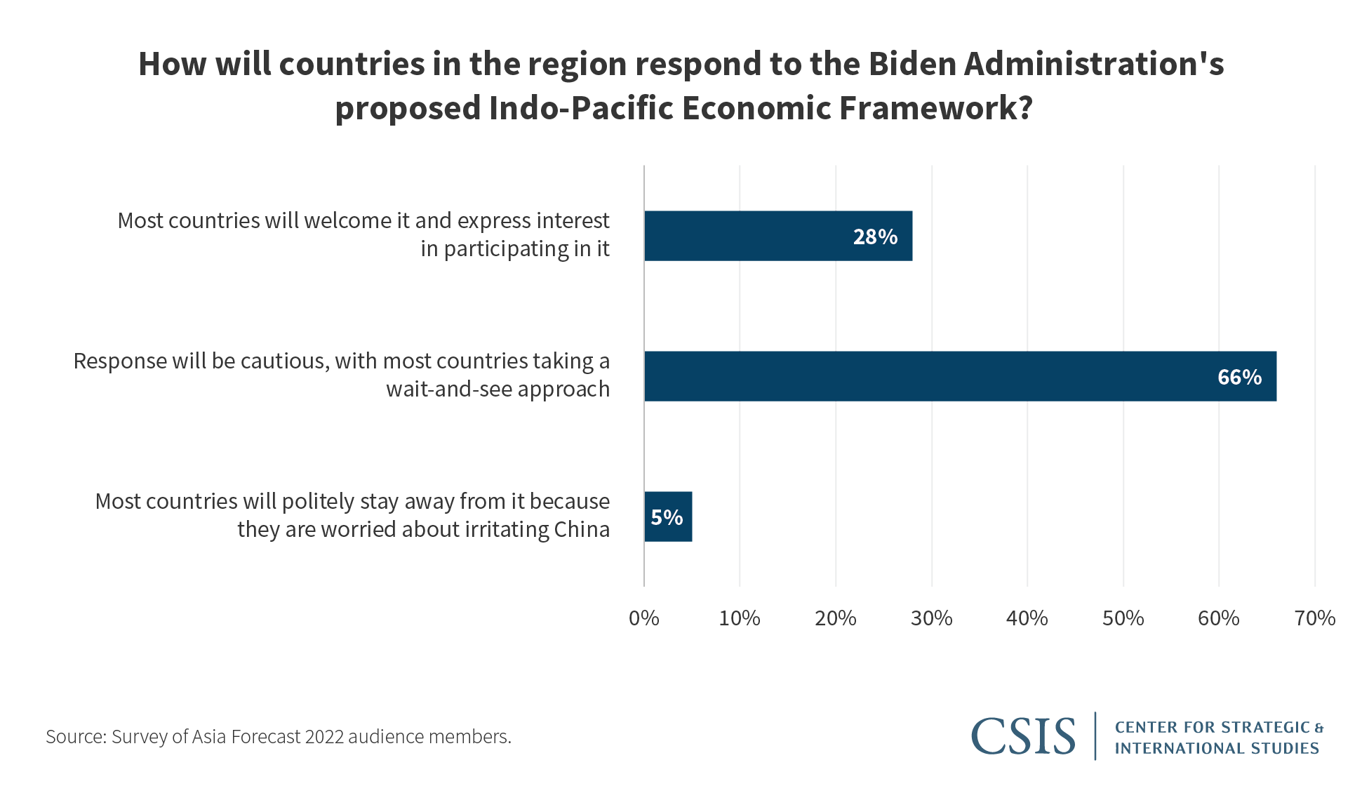 Two-thirds of the audience believed that the region will take a wait-and-see approach when it comes to the Biden administration’s proposed Indo-Pacific Economic Framework (IPEF). Though there will be interest from countries with close ties to the United States, such as Australia, Japan, New Zealand, Singapore, and South Korea, Reinsch expects other countries in the region to be unsure about whether they will derive tangible economic benefits from participating in the IPEF. Increased U.S. market access is not up for consideration, and some countries are concerned that if IPEF does not require congressional approval, the United States might not be willing to make any major concessions. Kennedy also suggested that hesitancy, including from regional allies and partners, is also in part due to U.S. partisan politics, with many countries unsure if the IPEF will endure beyond 2024.
