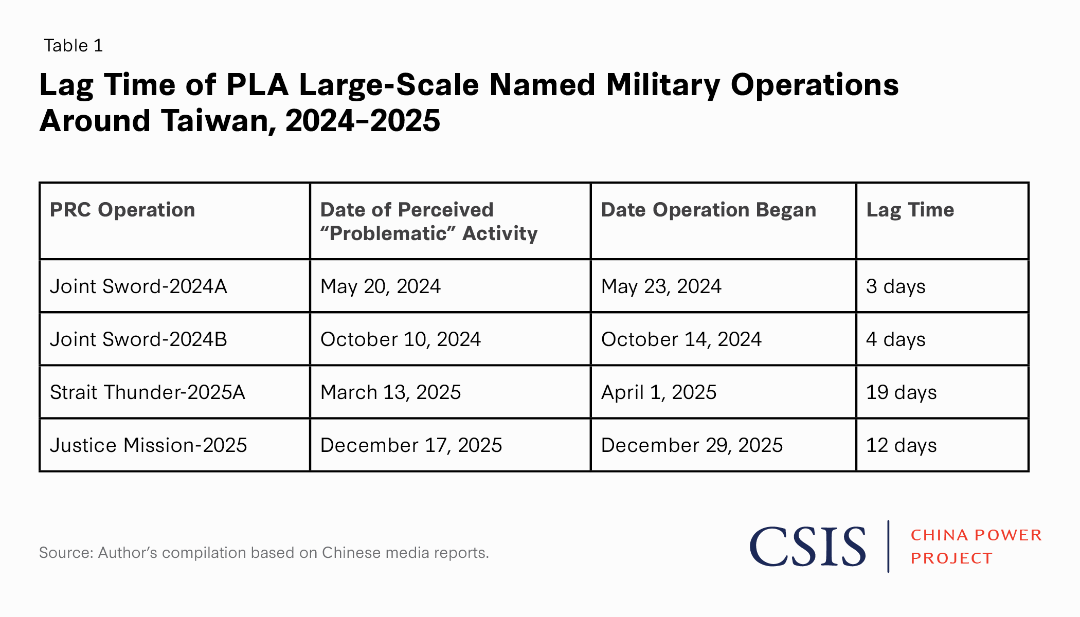 Leadership gaps, however, may have delayed China’s ability to execute large exercises around Taiwan in 2025. In 2024, China reacted within three to four days to what it viewed as “problematic” behavior from Taiwan, launching two Joint Sword exercises in May and October. In contrast, it took the PLA 19 days to launch a large-scale exercise in April 2025 and 12 days in December 2025.