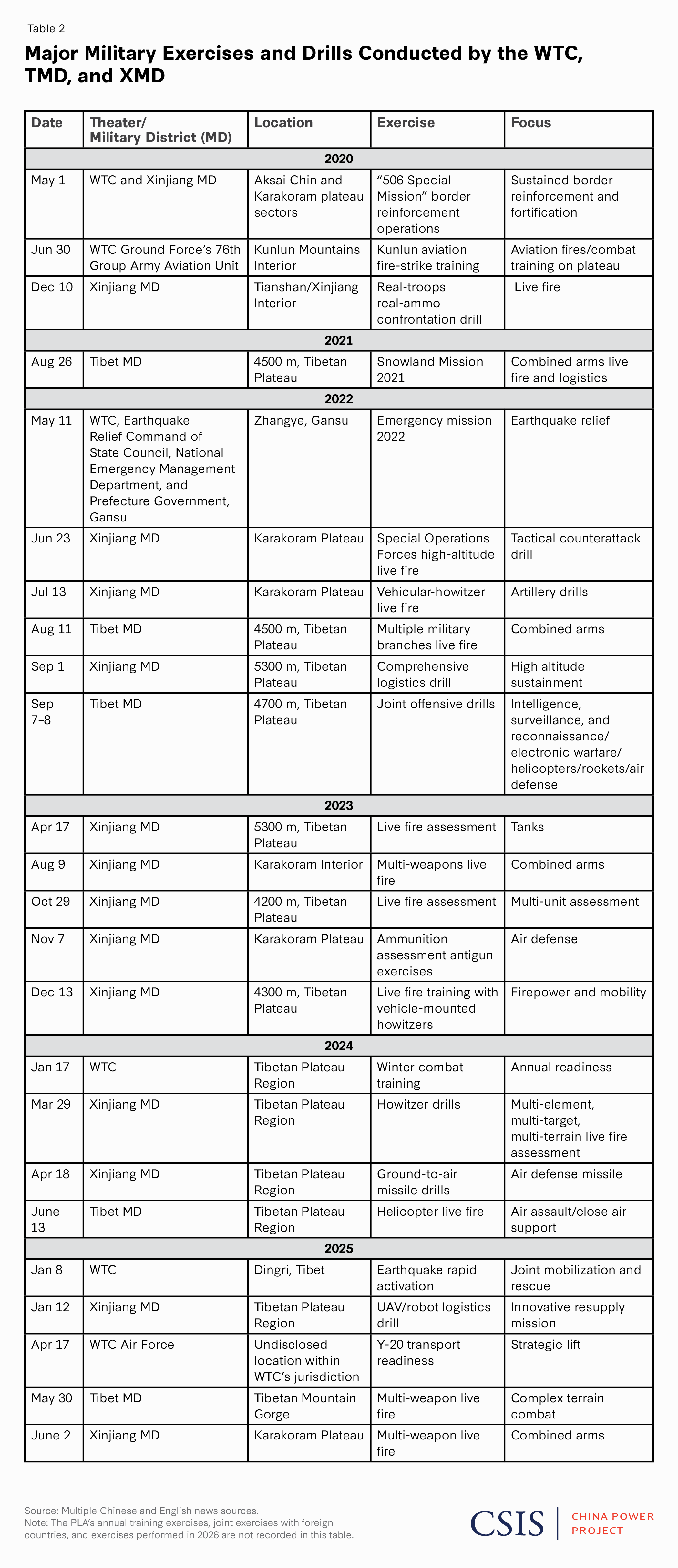 Counterintuitively, despite these purges, the number of military exercises and drills per year across the WTC, XMD, and TMD has largely remained constant over the past three to four years. These activities include PLA annual military exercises at the beginning of each calendar year, which began following an order from Xi Jinping, chairman of the Central Military Commission, to mobilize troops. They also include seasonal training drills conducted by the PLA at the onset of harsh Tibetan winters to acclimatize units, as well as joint bilateral exercises with foreign armies in the region. More importantly, the exercises also include at least five special military exercises, joint operations training and drills, and contingency-specific exercises that units in these regions have conducted annually since 2022.