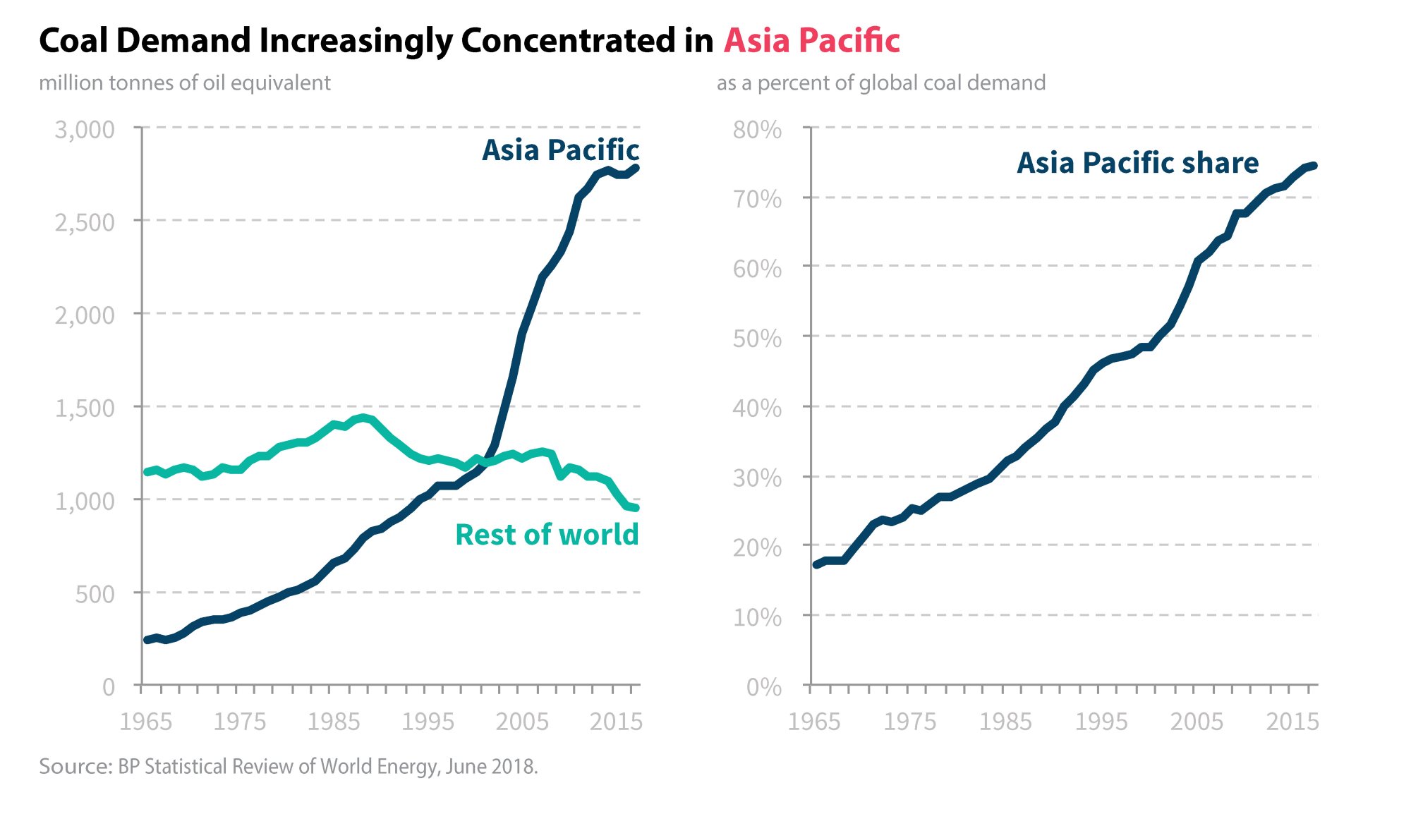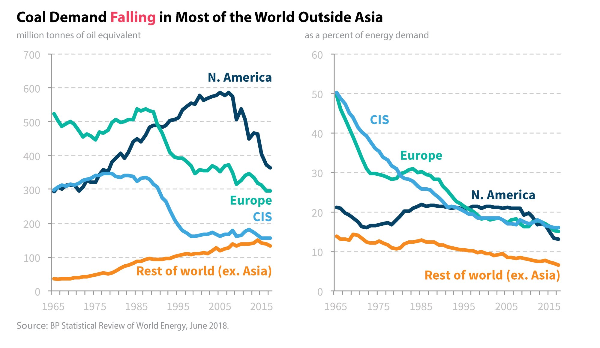 The shift of coal demand to Asia is seen in numerous data points. According to the BP Statistical Review of World Energy, the Asia Pacific region consumed 75 percent of the world’s coal in 2017, up from 50 percent in 2000. This share is higher than for any other fuel or energy in general: 36 percent for oil, 21 percent for gas, and 42 percent for overall energy. More importantly, Asia is the main driver of growth: demand for coal outside Asia peaked in 1988 and has since fallen by a third. In that same period, coal demand in Asia has risen by 3.5 times.