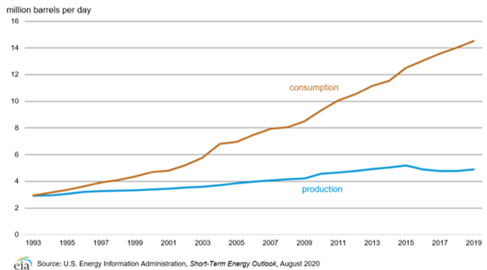 China’s Rising Dependence on Petroleum Imports 1993-2019
