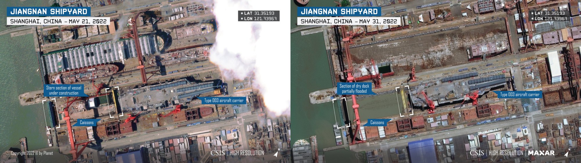 After a long lull at the usually busy Jiangnan Shipyard, China is one step closer to launching its largest and most advanced aircraft carrier—the Type 003. Satellite imagery from May 31 shows that the dry dock where the much-anticipated warship is currently positioned has been cleared of other shipbuilding projects, leaving an open path for the flattop carrier to enter the Yangtze River. The move comes after a stretch of limited activity at Jiangnan, which reports suggest were likely due to strict lockdown measures amid a Covid-19 outbreak in nearby Shanghai.