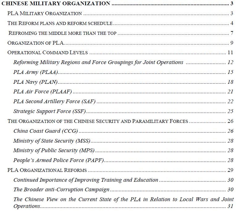 A new report by the CSIS Burke Chair attempts to address these issues, and the full table of contents is listed below. The report is available for download on the CSIS website at https://csis-website-prod.s3.amazonaws.com/s3fs-public/publication/160801_chinese_military_reform.pdf.