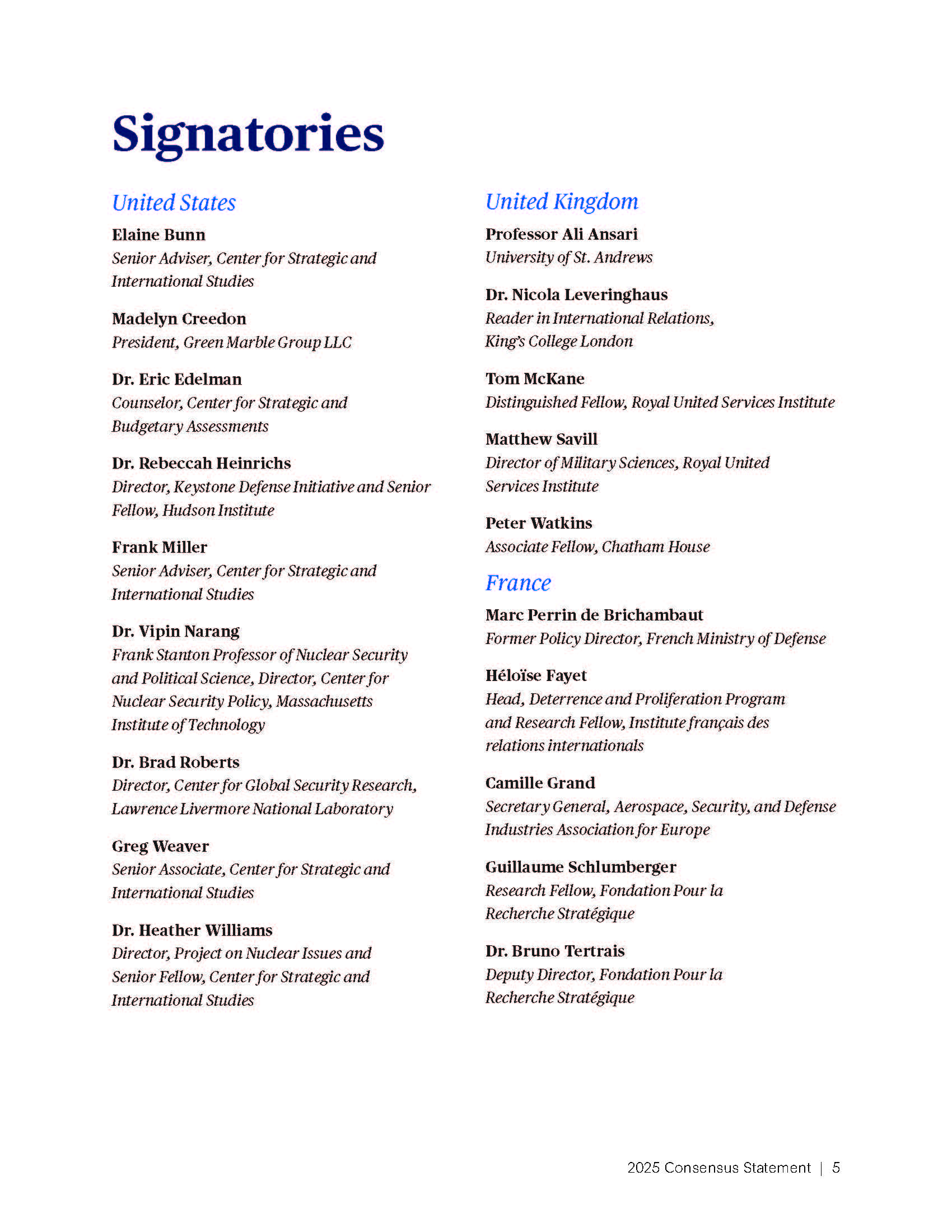 Each year, the Track 2 members of the group issue a consensus statement reflecting their discussions. All signatories agree to this statement in their personal capacities. In 2025, the group’s discussion addressed a range of emerging strategic challenges for the P3, which are reflected in this statement of their consensus after the 2025 round of meetings.