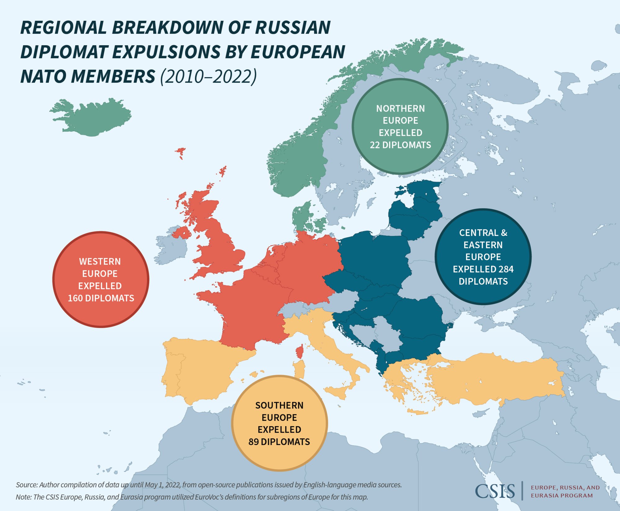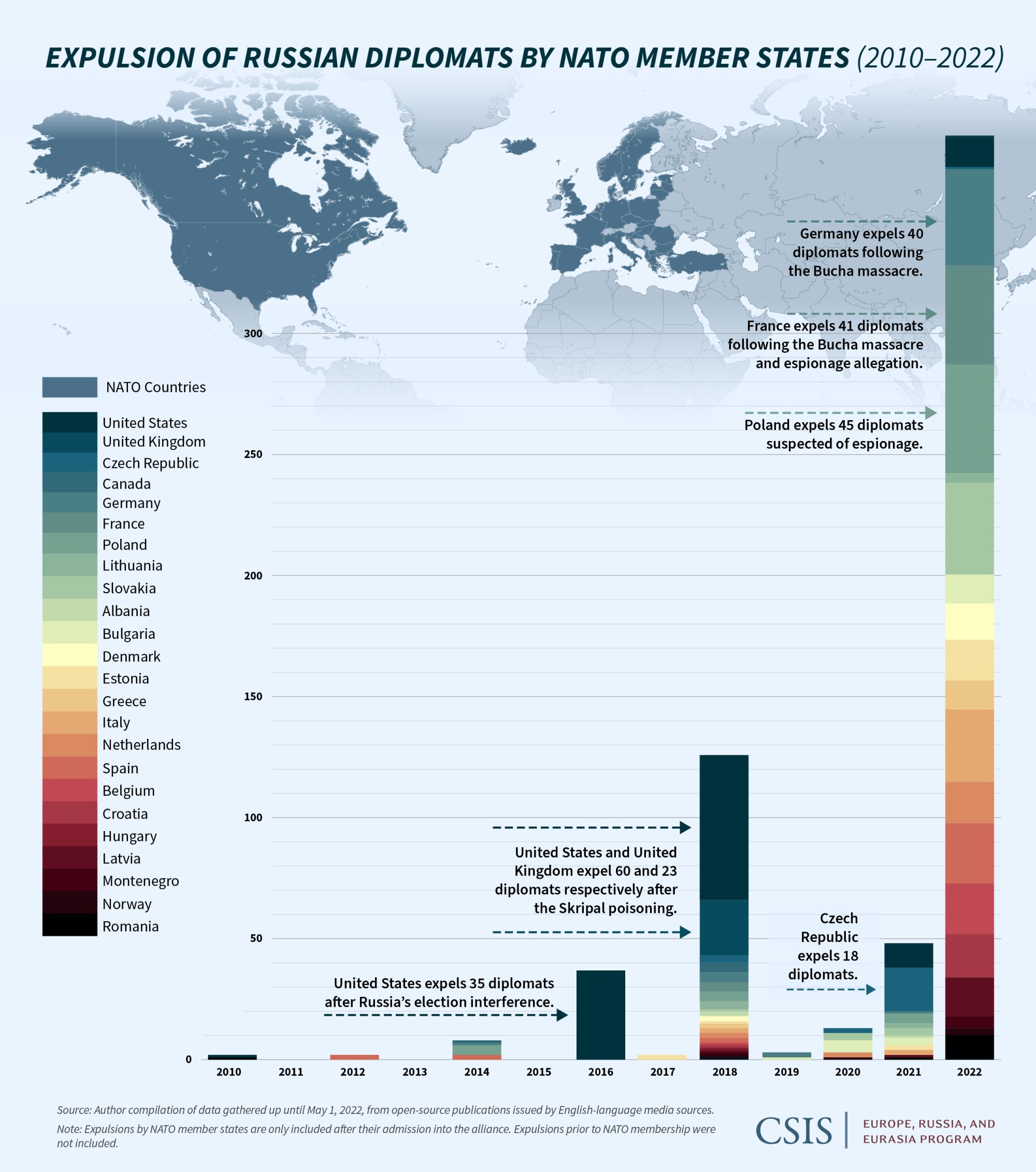 In contrast, within two months of Russia’s latest invasion of Ukraine, over 25 EU and NATO members expelled in a coordinated fashion over 400 Russian diplomats. Poland, Germany, and France have led the charge by expelling over 40 personnel each, compared to less than 5 staff in earlier waves. If 21 NATO countries took part in the collective expulsions in 2018, and even fewer in 2021, then 2022 has seen the largest and most expansive effort: only roughly a handful of the 30 members declined to join the wave—some of them, like the United Kingdom, because they already expelled a large number of Russian diplomats in previous waves.