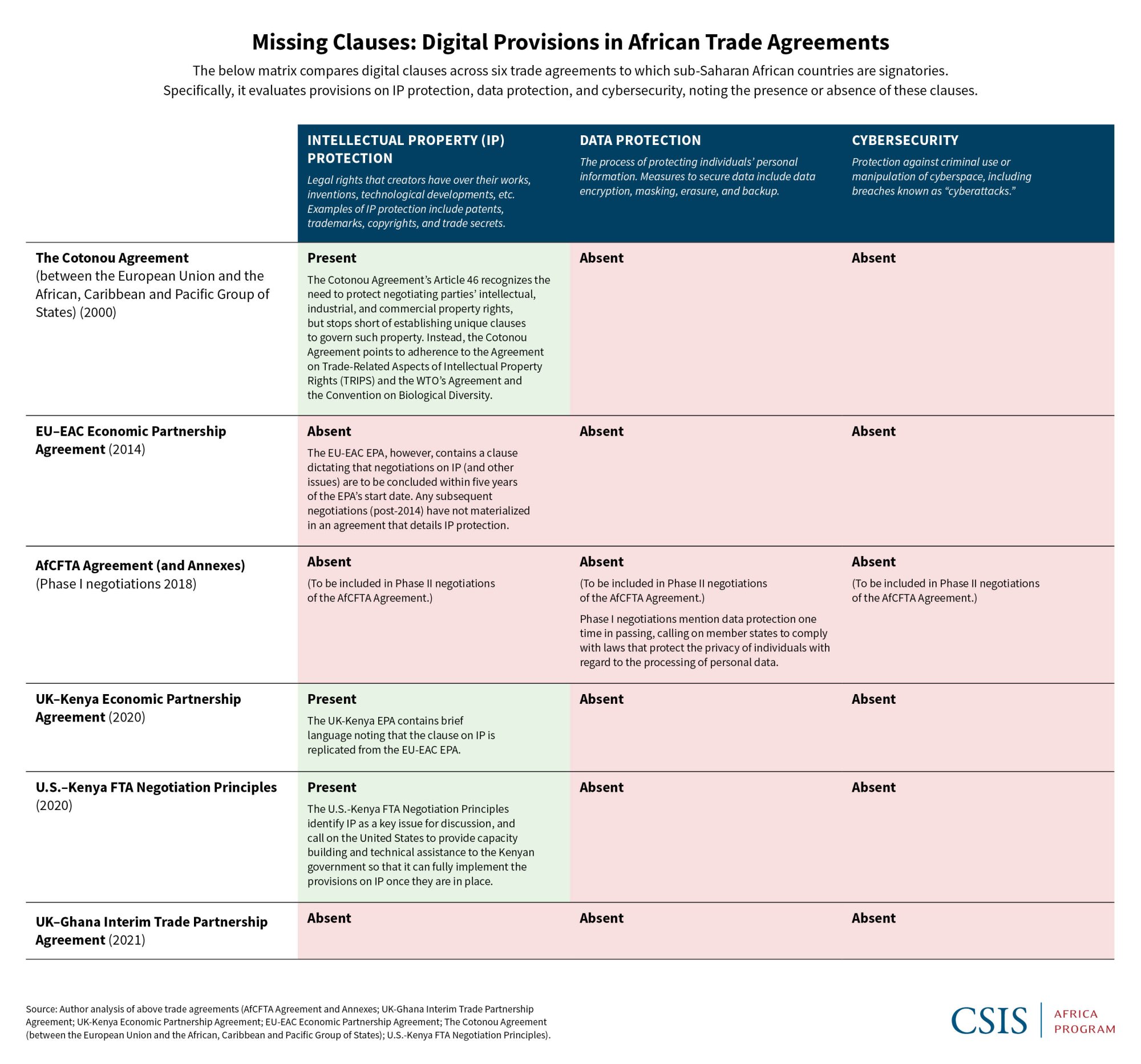 African governments are signatories to a variety of multilateral trade agreements that outline norms and regulations around issues such as technical barriers to trade (TBTs), tariffs, and other trade restrictions. As digital technologies and platforms play a greater role in everyday life—from purchasing groceries and filling a gas tank to accessing health clinics—it is critical for these agreements to ensure protection of individual, private, and government data and property rights. Many of these trade agreements, however, skimp on details when it comes to digital issues like IP protection, digital privacy, and cybersecurity. CSIS reviewed six key trade agreements on the continent—the African Continental Free Trade Area (AfCFTA) Agreement, UK-Ghana Interim Trade Partnership Agreement, UK-Kenya Economic Partnership Agreement, European Union-East African Community (EU-EAC) Economic Partnership Agreement, the Cotonou Agreement, and the U.S.-Kenya Free Trade Agreement (FTA) Negotiation Principles—and found that only half include vague or general provisions around IP protection, while none include clauses on data protection or cybersecurity.