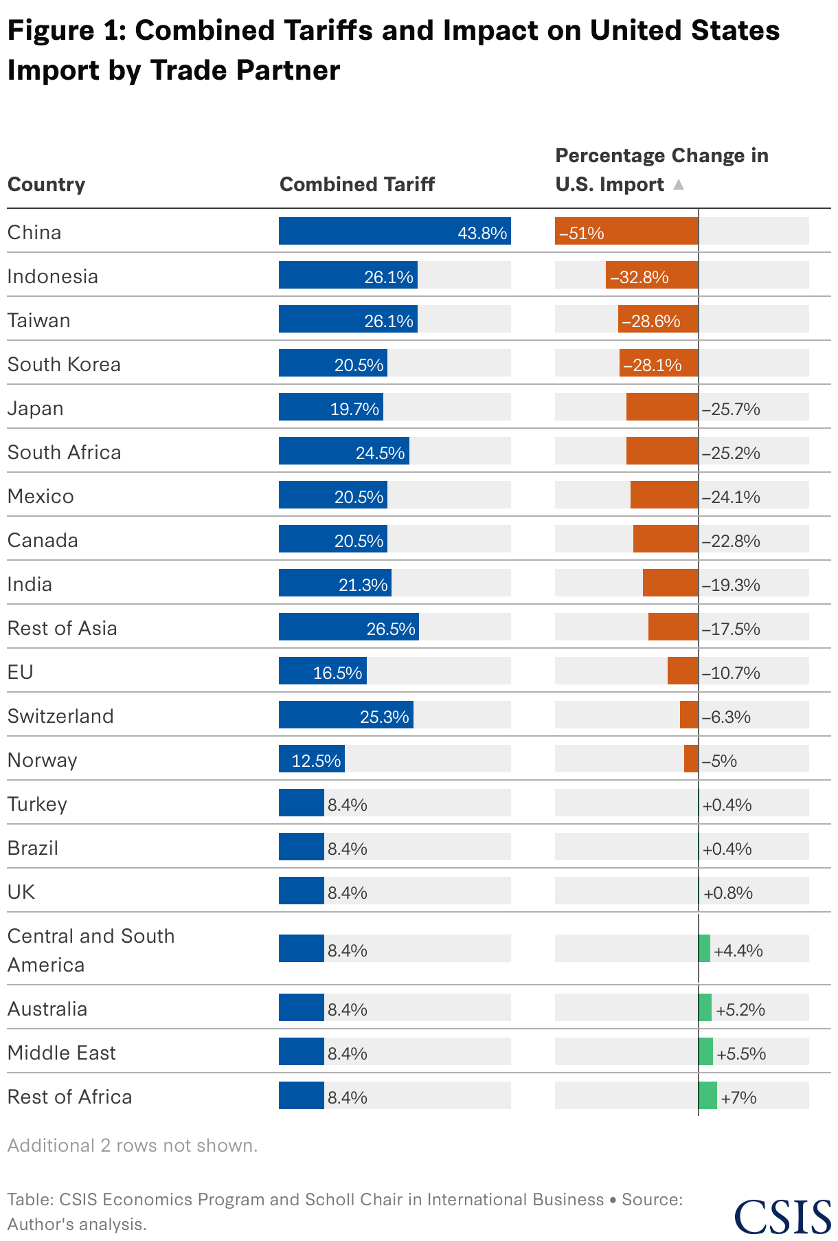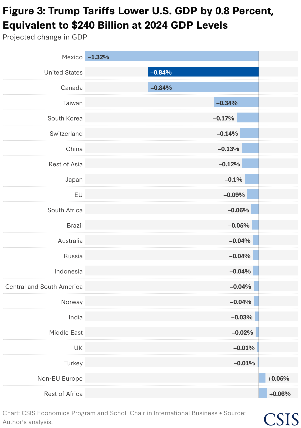 - Analysis by CSIS and the University of California, Santa Barbara (UCSB), finds that the proposed April 2 and earlier tariffs would lower U.S. GDP by 0.8 percent, while raising U.S. prices by 7.1 percent and U.S. wages by 6.3 percent. The tariffs would collect $330 billion in tax revenue annually.