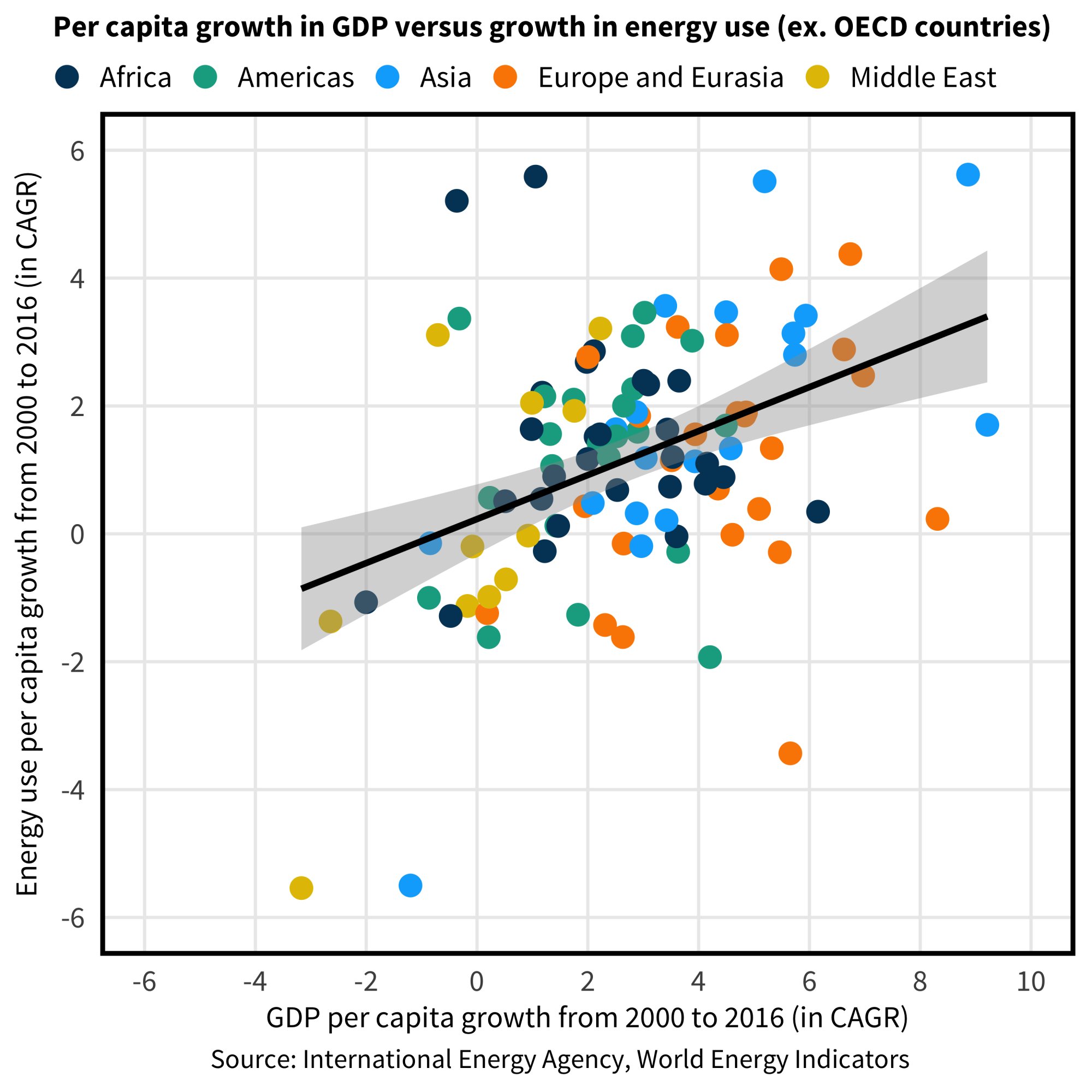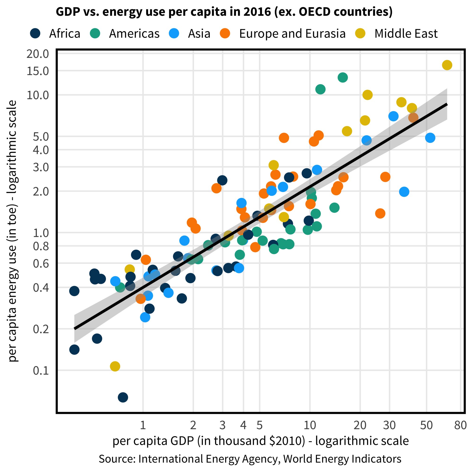 At a basic level, there is a relationship between income and energy use in non-OECD countries, measured as the association between per capita gross domestic product and per capita energy consumption in 2016 (data from the International Energy Agency). The link is clear both visually and statistically (a simple linear regression is statistically significant at the 0.001 level with an r-square of 0.55; and the slope is 0.18, meaning an extra $1,000 in per capita income can be expected to translate into a 0.18 increase in per capita energy use).