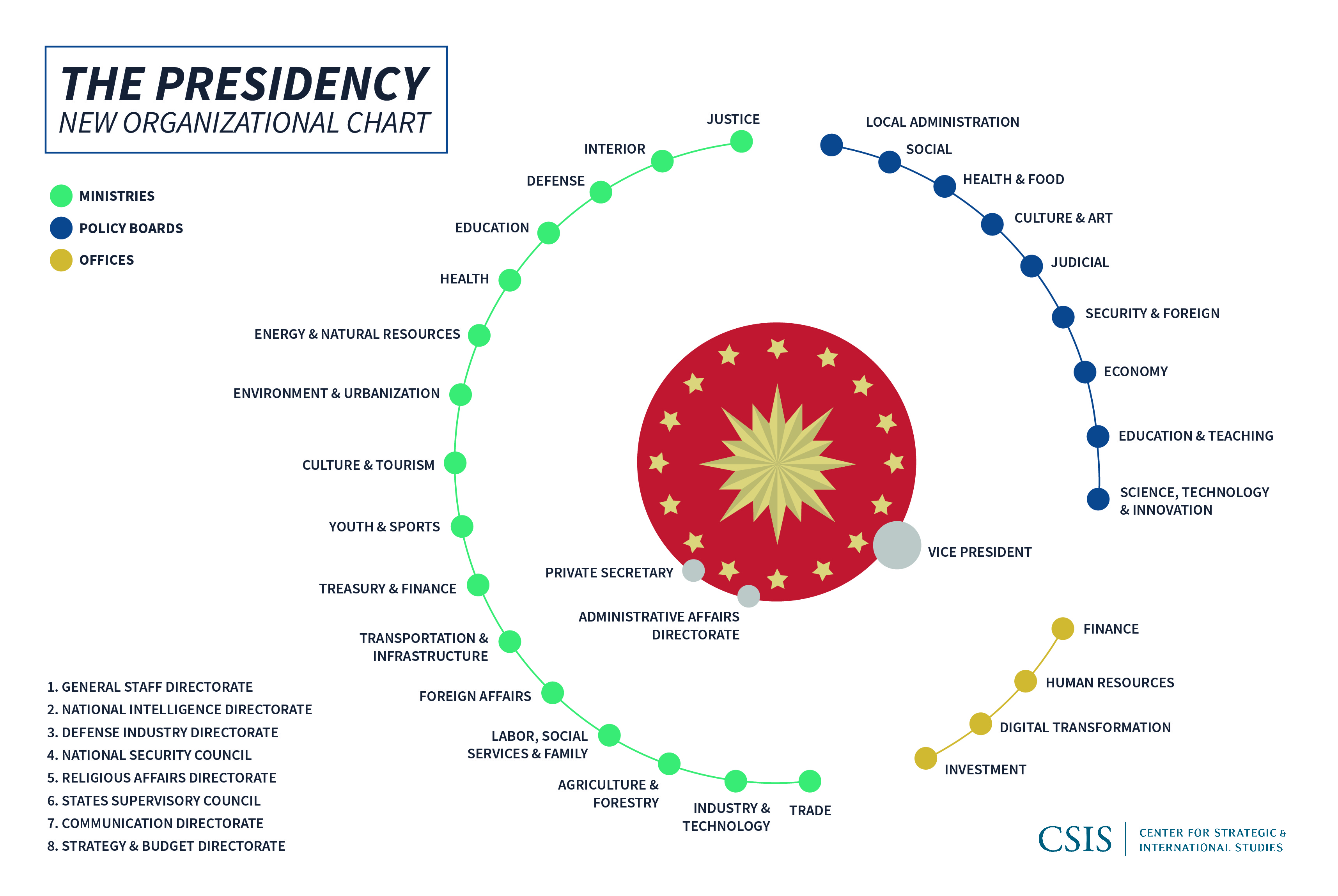 In addition, 65 existing boards, committees, and commissions have been merged into nine presidential policy boards on science, technology and innovation, education, economy, security and foreign policy, law, arts and culture, healthcare, and local administration and social policies. They will all have a vice chair and two other members and will report directly to Erdogan. As Presidential Spokesperson Ibrahim Kalin confirmed on July 13, they will “develop policy at the macro level.” Accordingly, it seems inevitable that they will constitute a challenge to the ministries in importance because of their proximity and access to the president.