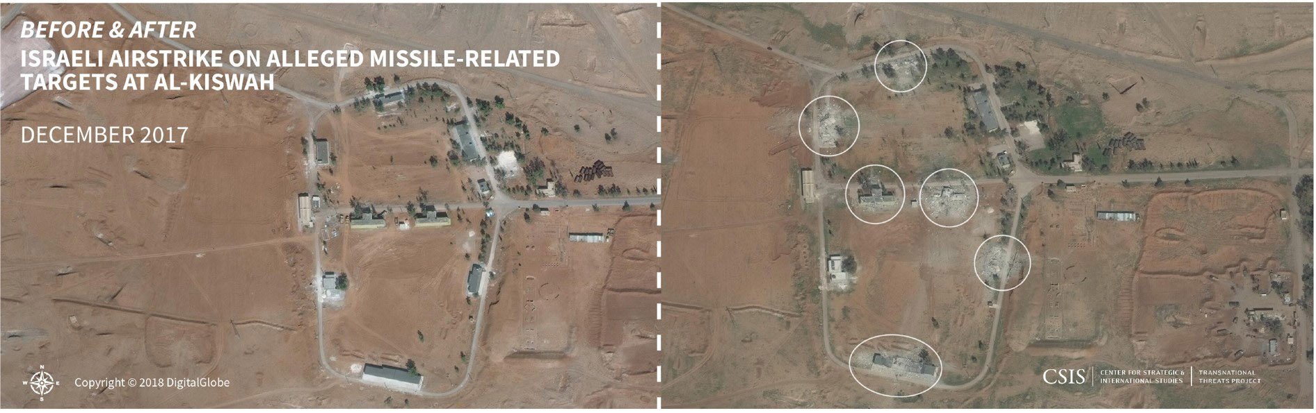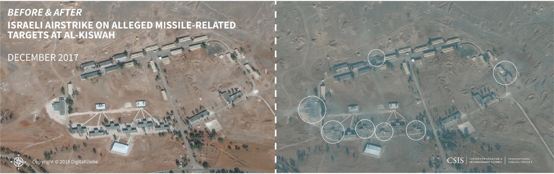Figure 7: Before and After Satellite Imagery of the December 2017 Israeli Airstrikes on Alleged Missile-Related Storage Facilities at Al-Kiswah