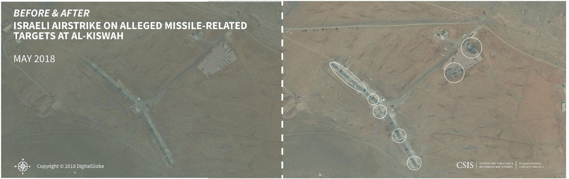 Figure 9: Before and After Satellite Imagery of May 2018, Israeli Airstrikes on Alleged Missile-Related Storage Facilities at Al-Kiswah