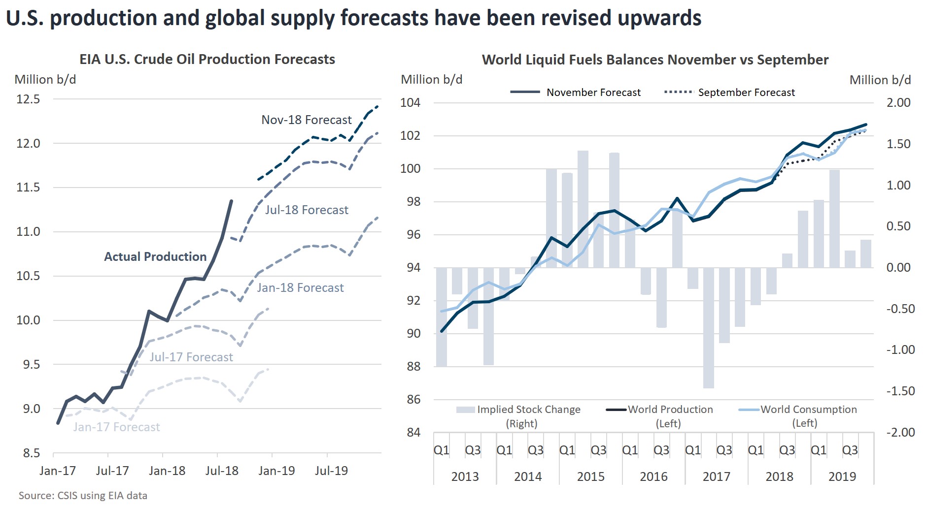 The upward revision of U.S. oil production data, which has continued to far outpace the forecasts, has been a recurring theme in 2018. According to the U.S. Energy Information Administration (EIA), the United States is now pumping 11.6 million b/d of crude oil, roughly 2 million b/d beyond what it was producing just this time last year. Assuming U.S production holds steady in December, year on year production growth will reach 1.5 million b/d or 2.1 million b/d including natural gas liquids, an all-time high. This astonishing growth has accounted for 90 percent of the net increase in global production and more than 140 percent of the increase in demand.