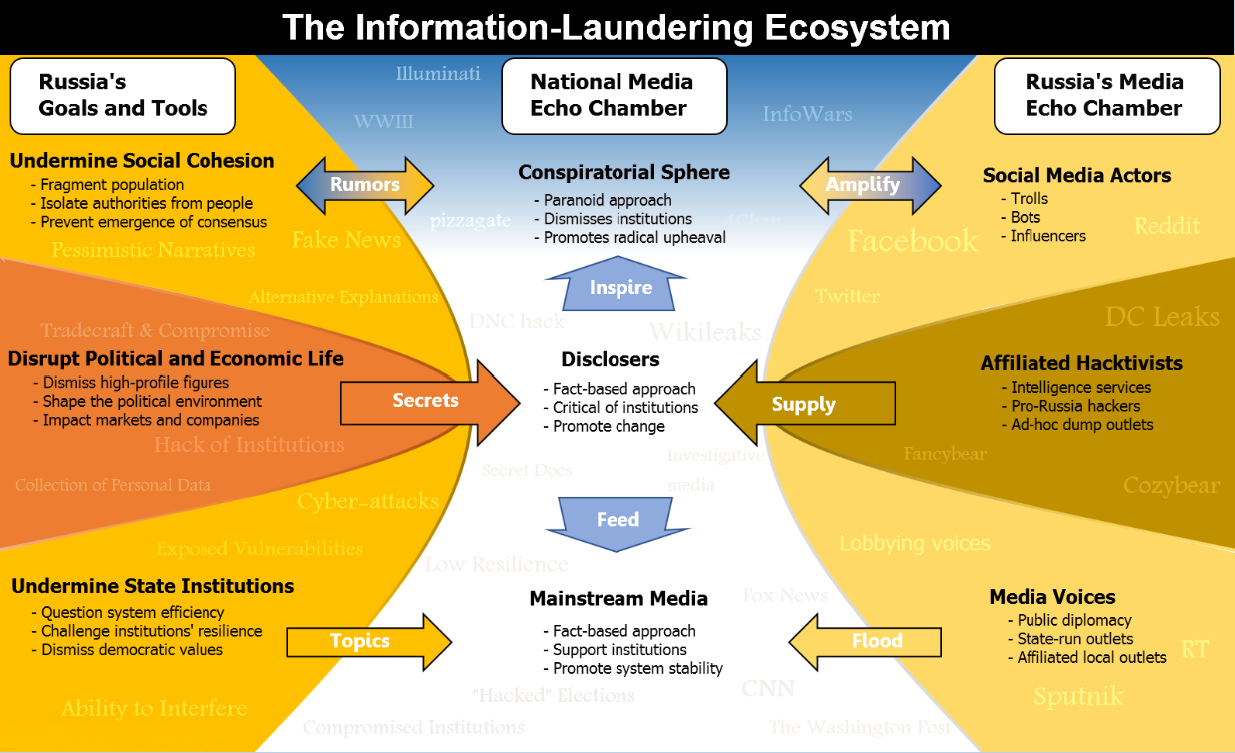 In order to help advertise its sponsored content beyond fringe activists and increase its survivability, the interfering actor uses its own echo chamber. This media ecosystem, enhanced by affiliated leakers and a troll army on social media, is able to establish connections to the independent U.S. media outlets and funnel narratives. Affiliated disclosers try to gain attention by disclosing a story or passing it on to dump outlets. As the U.S. media sphere digests the story, the tale gains a life of its own, laundered from the initial obvious traces of interference. At that stage, the ghost media system gives it a further iteration of attention, reinforcing the story by quoting genuine national media sources about the initial story. Russian-sponsored channels like RT or Sputnik flood the public with intense negative messages associated with the initial story, amplifying or twisting facts in a way that challenges or dismisses the mainstream media’s description of events. Across social media, were psychological arousal drives virality, an army of trolls and bots promotes catastrophic interpretations of the events. In principle, none of the U.S. media sphere elements needs to be wittingly involved for the scheme to succeed. They only need to exist and play the role Russia has assigned to them as an echo chamber. This represents a systemic vulnerability to external manipulation.