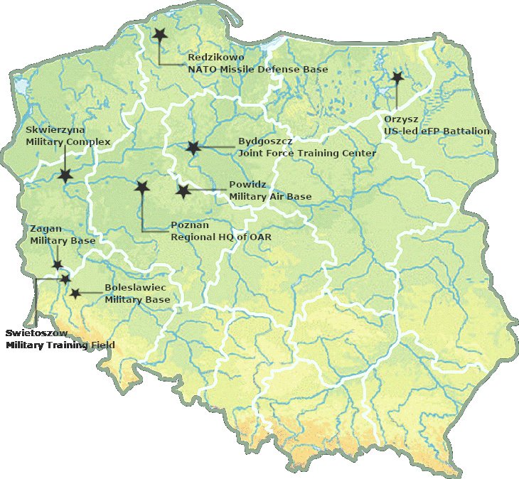 The United States already has a robust presence throughout Poland, to include along the eastern border where the United States is responsible for the eFP battlegroup deployed in Orzysz. It totals over 1,100 soldiers, of which 795 are American (with one Stryker Squadron, with towed artillery, Mobile Gun System, and Anti-Tank Guided Missile platoons). Taken with the heavy armored Brigade Combat Teams (BCT) deployed for heel-to-toe nine-month rotations, under the framework of Operation Atlantic Resolve, there are about 4,000 U.S. troops deployed throughout Central Europe. Other U.S. military personnel are also present in Poland, on a permanent or rotational basis in various structures (see map).