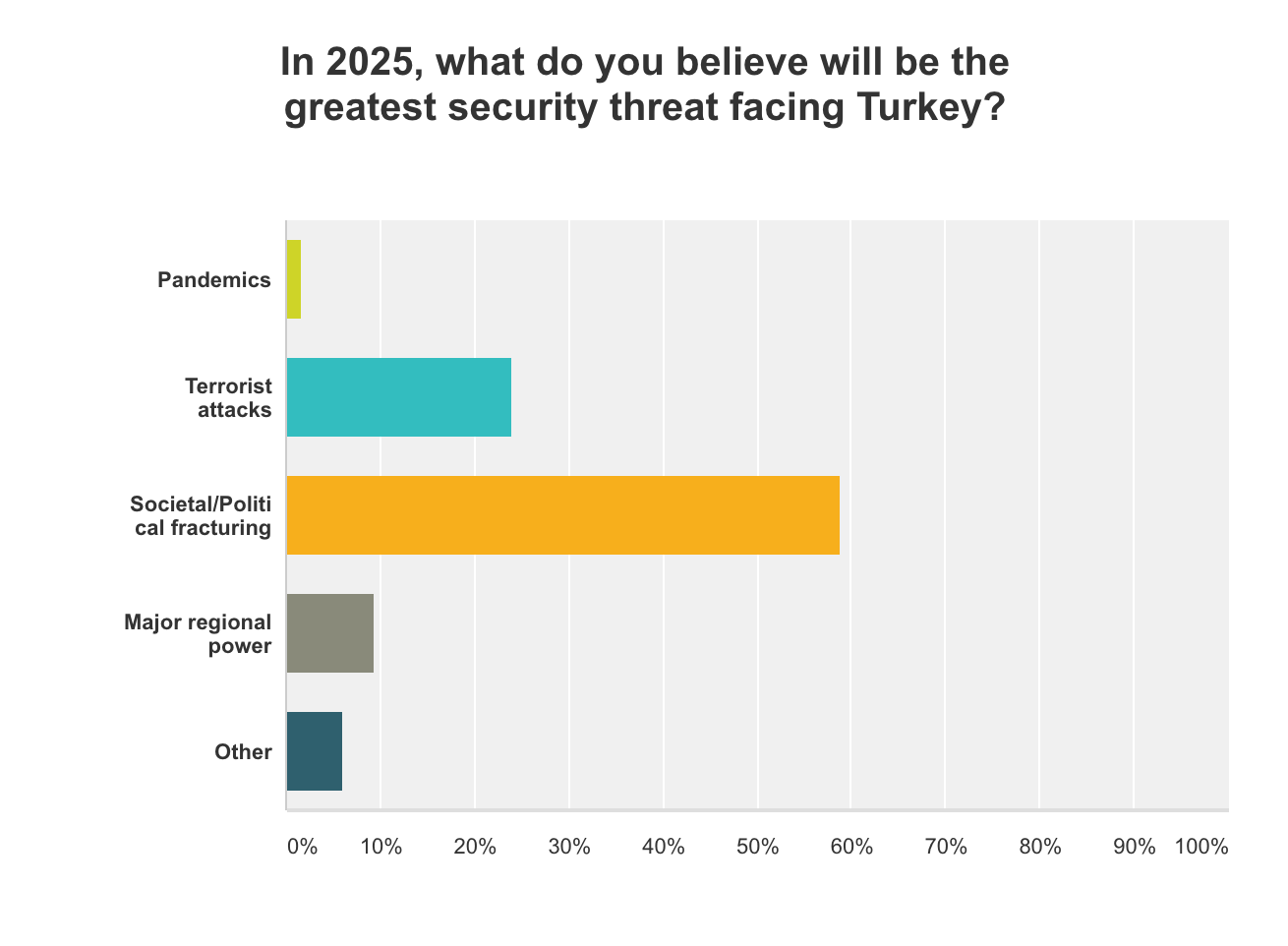 Nearly 59 percent of respondents to our survey believed that the greatest security threat to Turkey in 2025 would be social/political fracturing.