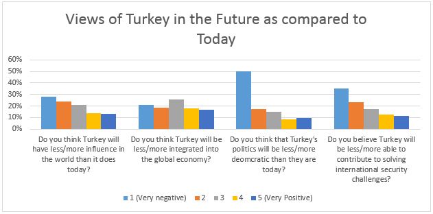 Further, when asked to compare Turkey’s future in 10 years to its present situation, over 50 percent of respondents believed Turkey would have less influence, be less democratic, and be less able to contribute to solving international security challenges than it is today.