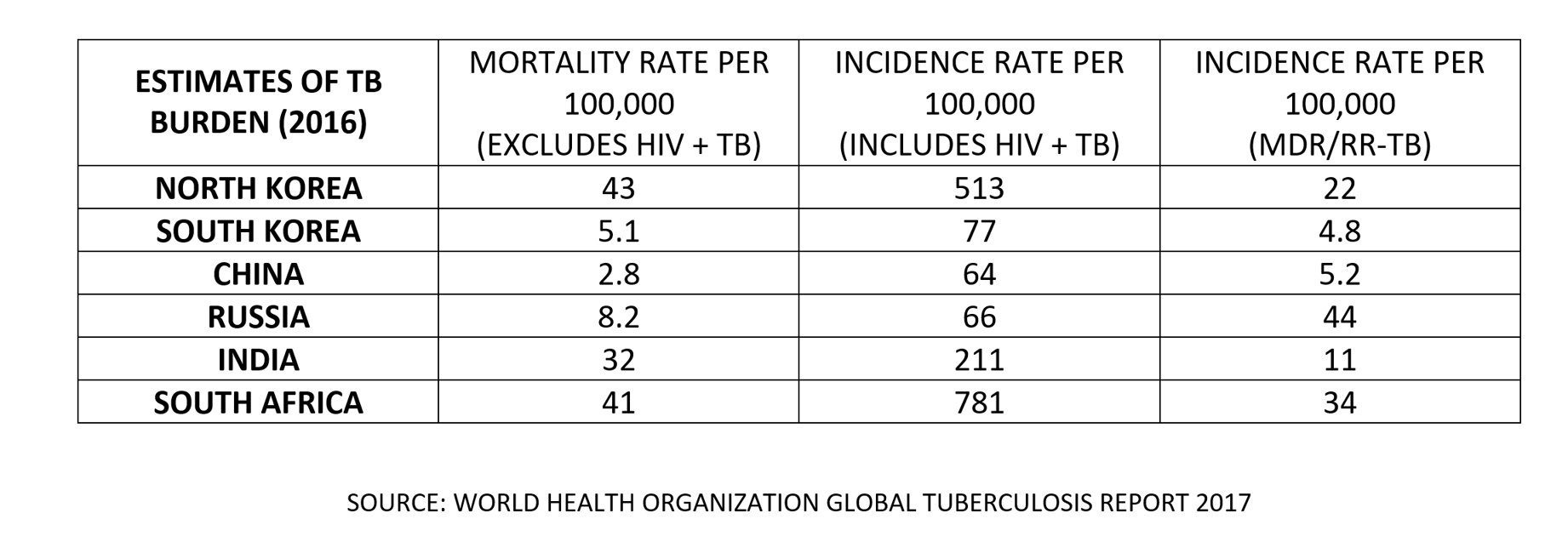 North Korea has an exceptionally high incidence of untreated drug-susceptible tuberculosis and rising MDR-TB. Though there has been no national survey on MDR-TB, independent experts estimate there are 5,000 to 6,000 MDR-TB cases, and there’s a good chance the true numbers are much higher. The Eugene Bell Foundation tested 947 TB samples in 2007–2009 and found that 76.9 percent of TB patients had MDR-TB. At present, there are no fewer than 120,000 patients receiving TB treatment through international programs. As the table below attests, North Korea is a glaring standout globally with respect to tuberculosis.