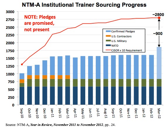 We passed a significant milestone this week - we are now at 50% of our authorized number of Coalition trainers, the highest we've been since NTM-A was activated in November 2009. However, the lack of the other 50% of Coalition trainers/advisors with key skills (critical gaps, in medical, logistics and engineers) threatens to slow progress in ASNF development at the time when we need to be accelerating... We continue to make significant progress growing the fielded forces, yet the development of their supporting logistics system is lagging. The absence of these skilled trainers and advisors is slowing the development of functional sustainment systems - at echelon above Corps, Army and Police supply depots and training centers--and the indigenous capacity necessary to effectively manage them... We continue to maximize contractors where we can but at a significant financial cost. Only by filling our critical shortfalls with the right grades and skills from the coalition can we properly develop a professional, sustainable and enduring logistics system for the ANSF... These trainers and advisors are also central to our anti-corruption efforts and providing the necessary safeguards and oversight to ensure stewardship of our investment.