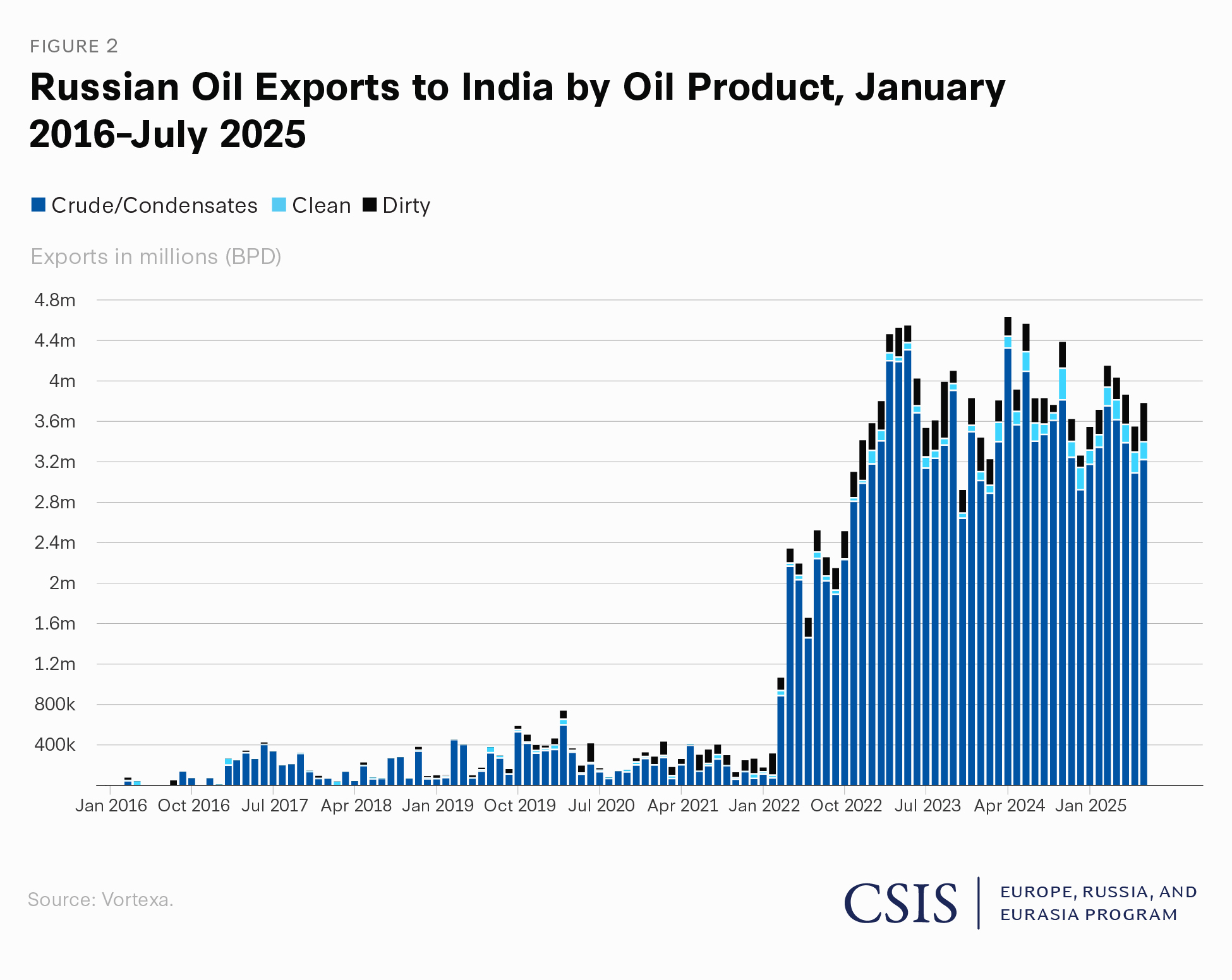 India continued importing large volumes of Russian crude in the first half of 2025 as well. For example, in May, June, and July of 2025, China bought 47 percent of Russia’s crude exports, while India purchased 38 percent. According to Vortexa, which tracks cargo for oil and gas trades, New Delhi’s crude oil imports from Moscow rose sharply in mid-June. This can be explained in part by market volatility triggered by the Israel-Iran conflict.