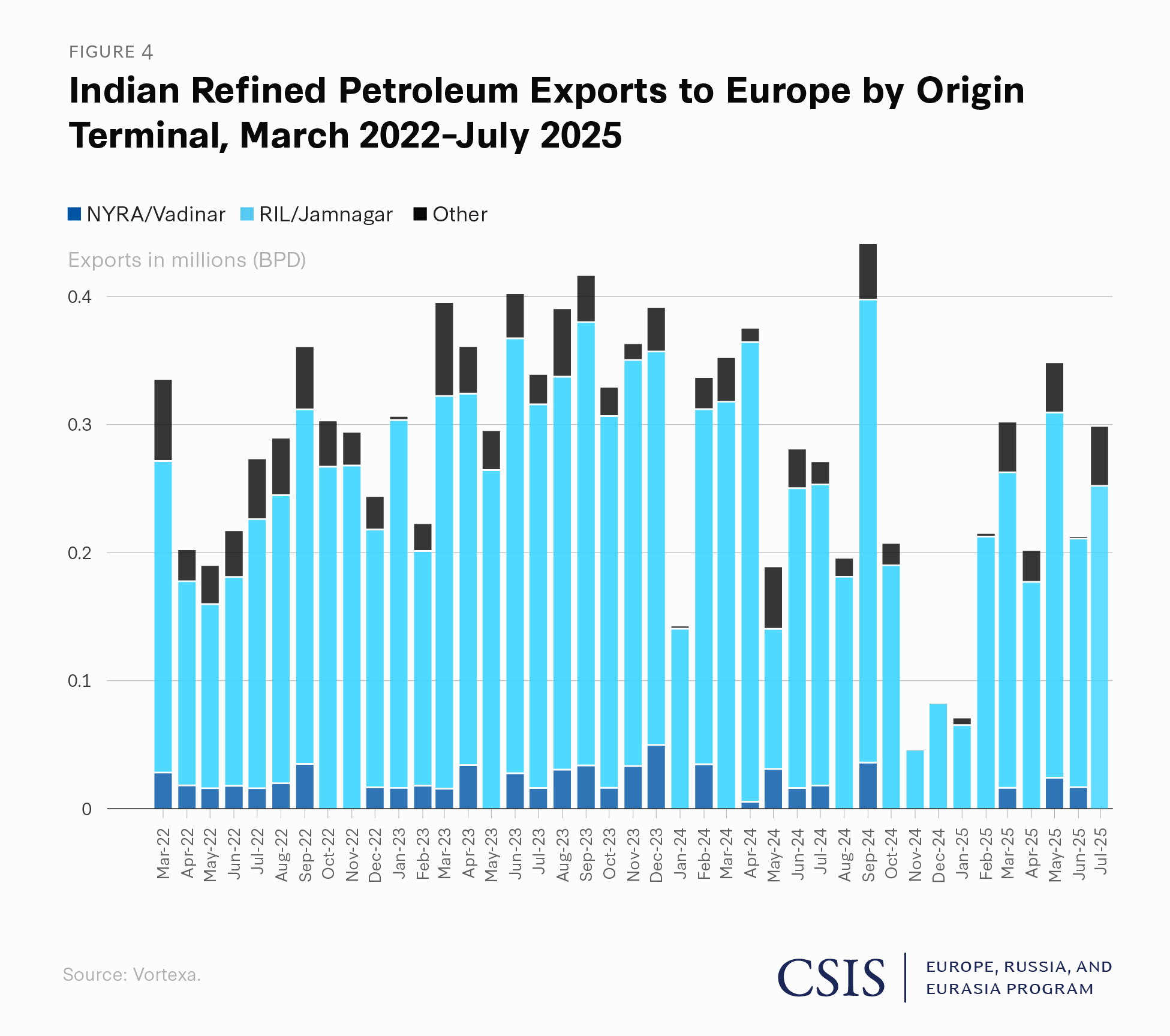 India’s other heavyweight buyers of Russian crude have included not just private actors but also government-owned companies such as IOC, Bharat Petroleum, and Mangalore Refinery and Petrochemicals. However, the major purchasers—and, thus, the major beneficiaries—of discounted Russian crude have been RIL and NYRA (see Figure 3).