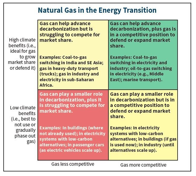 Given all these complexities, we can imagine four theoretical quadrants in thinking about how gas will fare in the energy transition. In one quadrant are sectors and countries where gas is likely to either gain market share or defend it, contributing to decarbonization, at least in the short to medium term. In another quadrant are markets where gas is in a strong competitive position but should be phased out eventually in a low-carbon pathway. A third quadrant includes markets where gas could help us achieve climate gains but is unlikely to thrive for various, mostly economic reasons. And the final quadrant is a place where gas is neither helpful in meeting climate goals nor likely to thrive. Which sectors and markets belong in each quadrant? And what might these quadrants tell us about the future of gas in the energy transition?