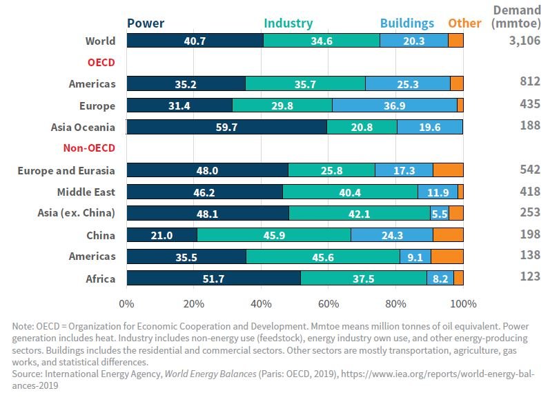 By contrast, only 40 percent of gas consumption goes into electricity. The rest goes mostly into buildings, for space and water heating as well as cooking, and into industry, largely as feedstock or for process heat. These numbers, moreover, vary greatly by region. Outside the countries of the Organization for Economic Cooperation and Development (OECD), 80 percent of gas is consumed in industry or power—only in a few places does gas play a major role in buildings, mostly in China, the former Soviet Union, and some countries in Latin America and South Asia. In OECD countries, buildings account for 28 percent of gas demand, with Europe being the most dependent on gas and Asia Oceania being the least dependent.