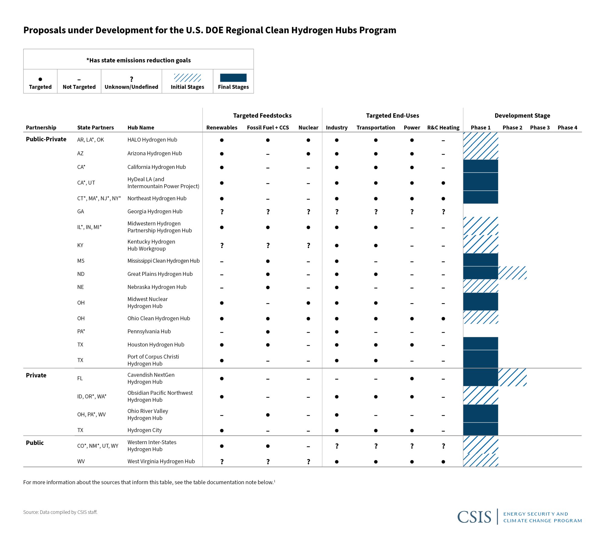 This commentary is informed by a comprehensive review of hydrogen hub proposals by CSIS staff. A lot is happening around this topic, so the authors will make an effort to update this review with new information or additional hubs as details are made available.