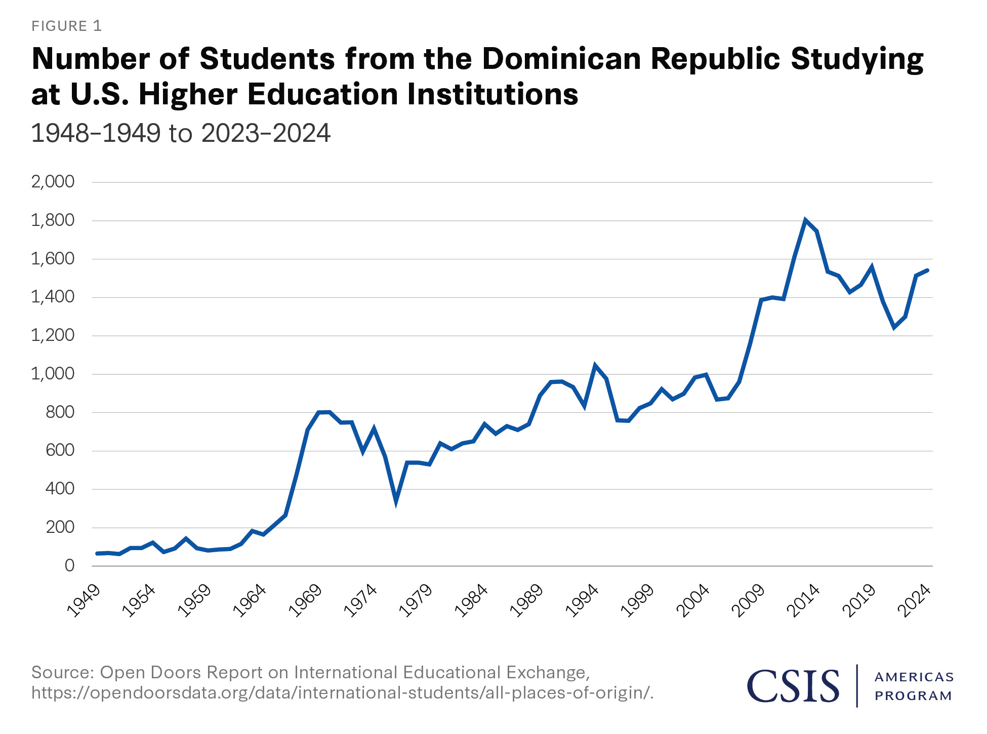 The Institute of International Education’s Open Doors, a 75-year research project on international educational exchange supported by the U.S. Department of State, has long tracked international education exchanges, including with the Dominican Republic. The trend line below shows the ebbs and flows of international students from the Dominican Republic studying in the United States since 1948–1949 (Figure 1). There has overall been steady growth in the numbers over time, with two periods of strong growth in the late 1960s and the late 2000s. The doubling of students between 2005–2006 and 2012–2013 may have been linked to several initiatives, such as scholarships from the Ministry of Higher Education, Science and Technology (MESCyT).