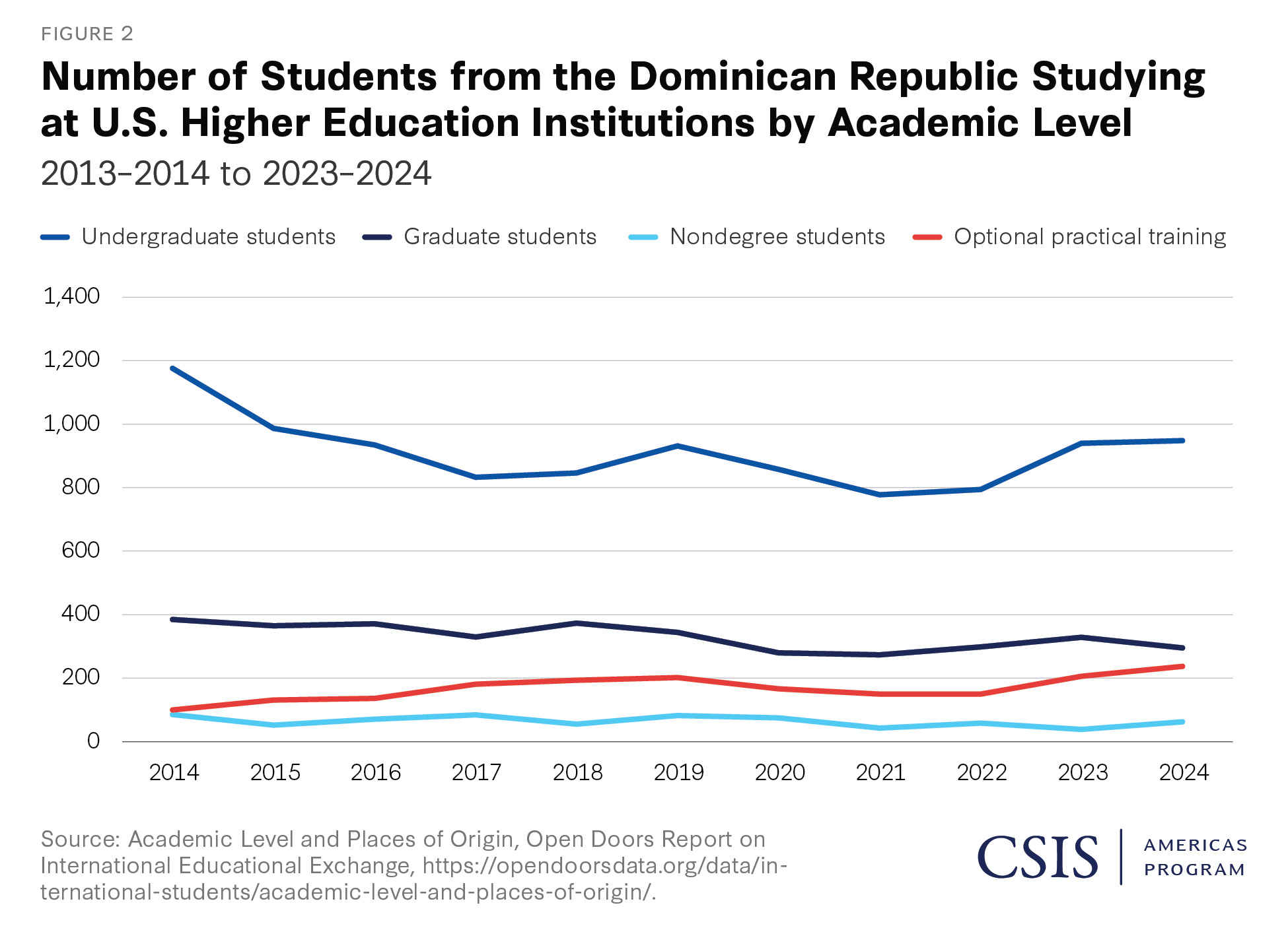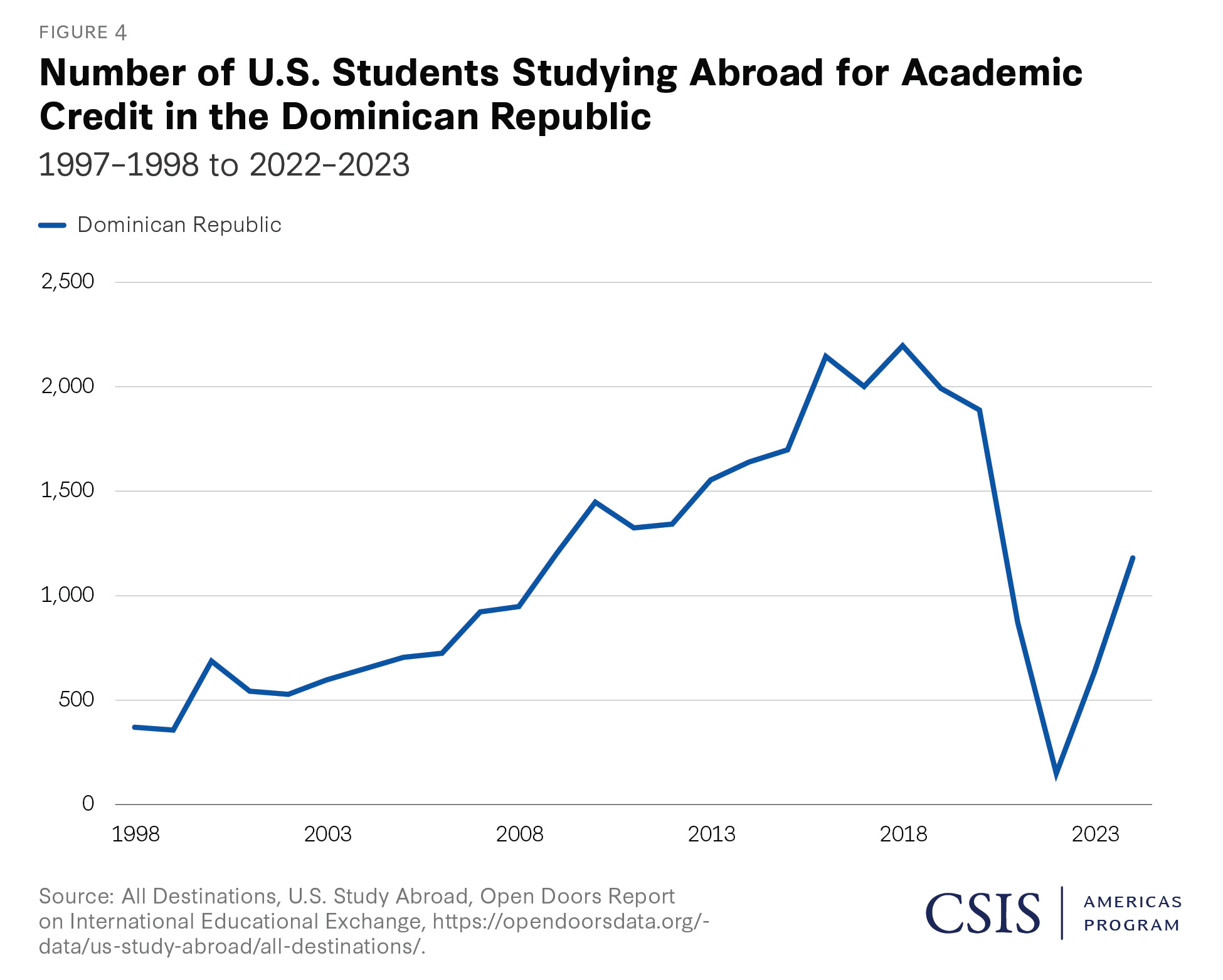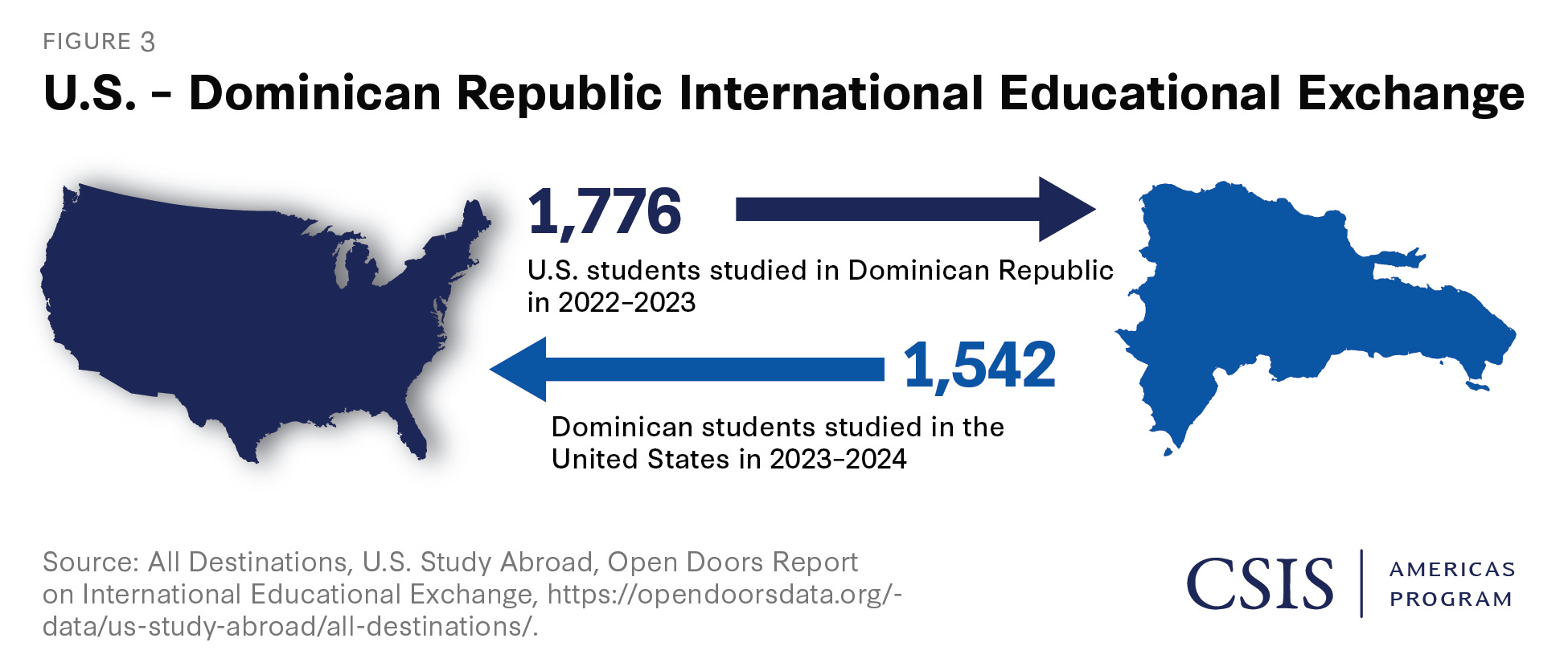 It is also important to consider educational exchange in the opposite direction. According to Open Doors data, 1,776 U.S. students studied abroad in the Dominican Republic in 2022–2023 (Figure 3). This includes two types of study abroad students: U.S. students studying abroad in the Dominican Republic from their U.S. college or university, either on academic credit or noncredit experiences. Many of these programs are likely faculty-led study abroad experiences rather than U.S. students directly enrolling in exchanges at local universities.