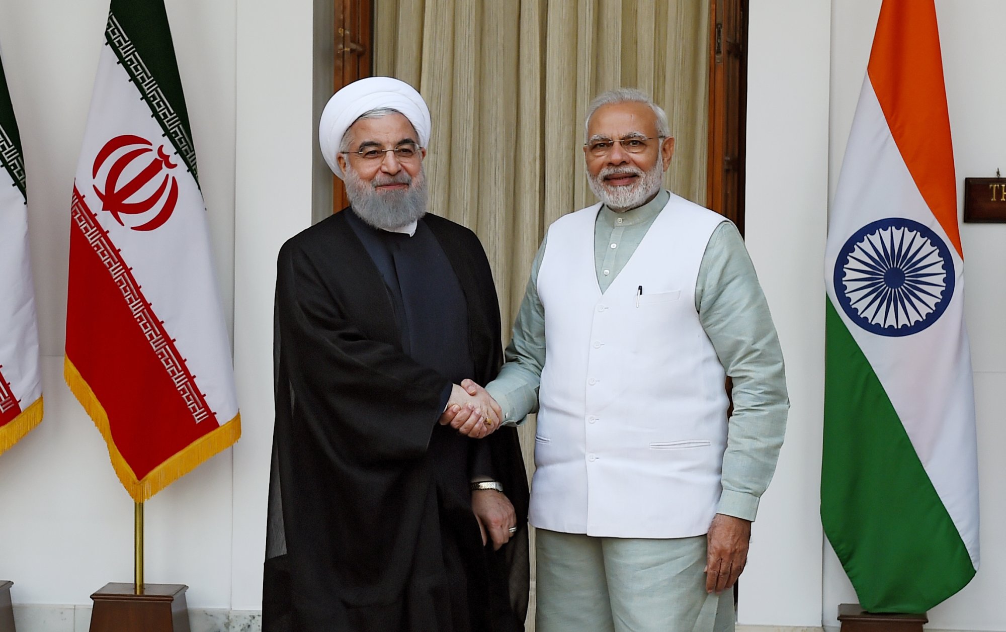 Iranian President Hassan Rouhani shakes hands with Indian Prime Minister Narendra Modi in New Delhi on February 17, 2018 - Money Sharma/AFP/Getty Images