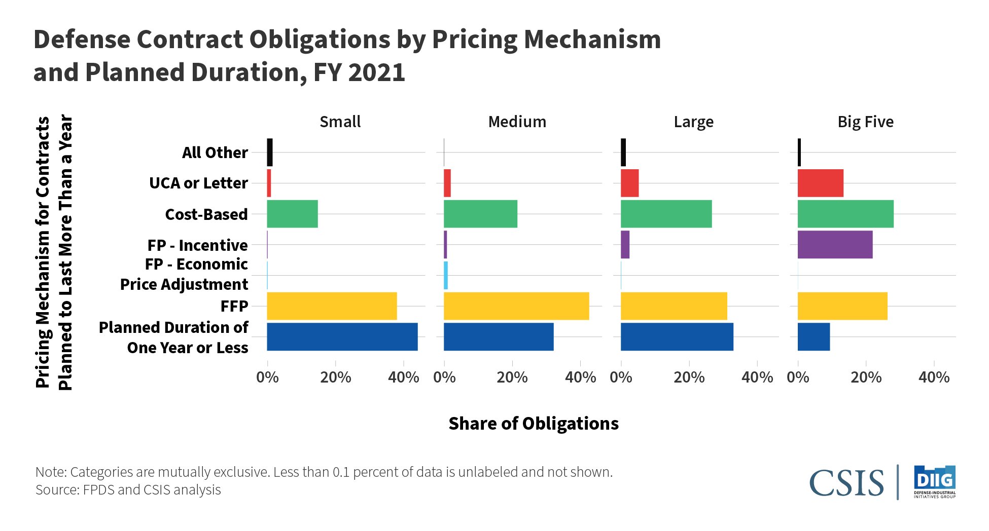 A3: CSIS analysis shows that small and medium contractors tend to engage in more FFP contracting, which is a common contracting method for less risky acquisitions. Larger firms that tend to work on more complex projects often have cost-based or incentive fee contracts better suited to large programs with more technical uncertainty. The second figure shows the distribution of pricing mechanisms by vendor size. Employing the more robust data available in recent years, it also adds two additional categories: “planned duration of one year or less” that includes all spending on these shorter contracts regardless of pricing mechanism used. As a result, all of the remaining categories show only contracts with a planned duration of greater than a year at the time of reporting. The other new category is undefinitized contract awards (UCA) or letter, which covers contracts whose exact pricing mechanism is still to be determined at the time of contract signing. While some of these contracts typically settle into a firm-fixed price approach, the delay in finalizing their details means that the contractor would be in a position to negotiate for inflation-related considerations.