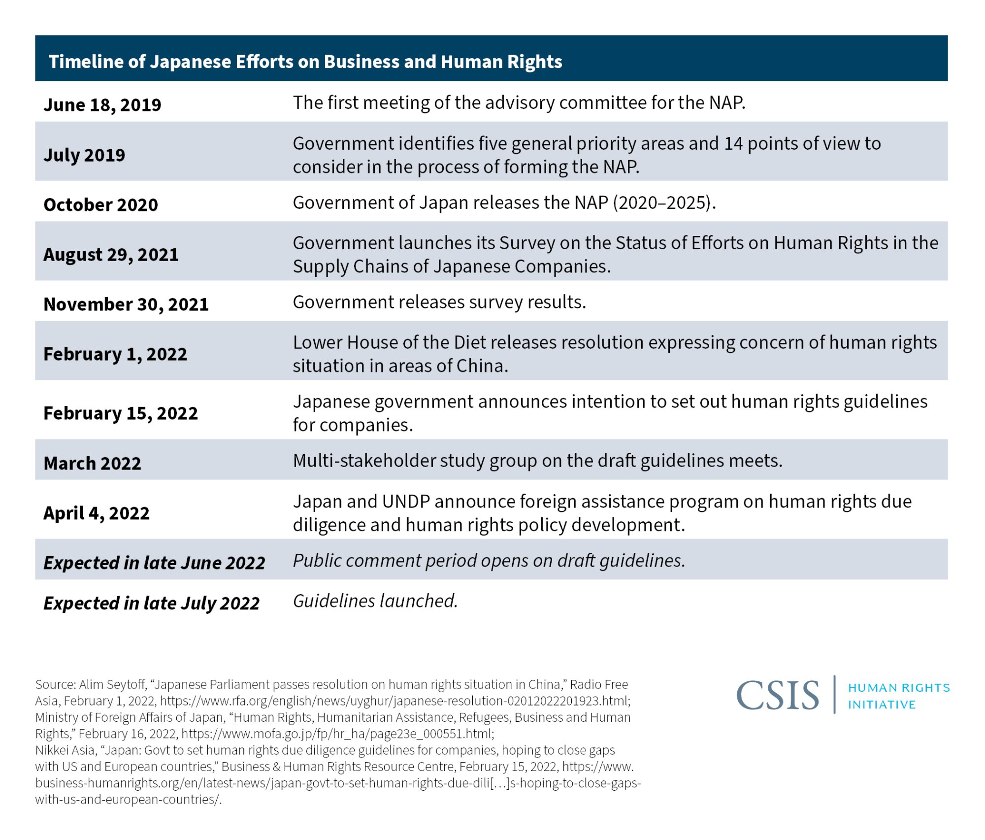 Finally, with the guidelines expected to be issued in summer 2022, the Japanese government has been convening business, labor, human rights, and academic stakeholders to input into the process, including the Japanese Trade Union Confederation, Keidanren, and the Civil Society Platform for Japan’s NAP.