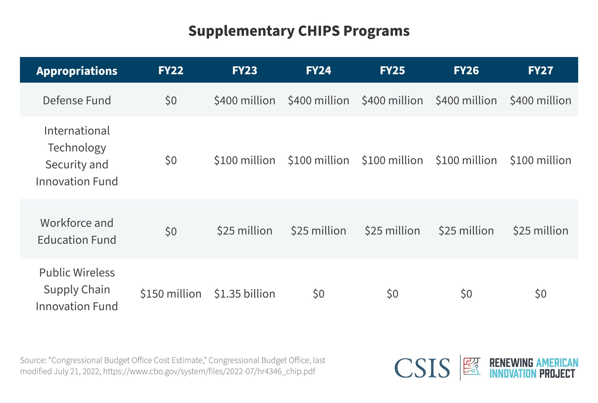 The bulk of the $39 billion is allocated for FY22, suggesting most of the spending will take place soon after this bill is signed into law. Of the $19 billion authorized for FY22, $2 billion will be dedicated toward facilities relating the production of “legacy chips,” or less sophisticated semiconductors critical for the automotive and defense industries. This allocation is meant to address short-term supply bottlenecks that are driving up prices for cars and slowing the production of military equipment such as Javelin missile systems being sent to Ukraine. For FY23–26, $5 billion is allotted per year.