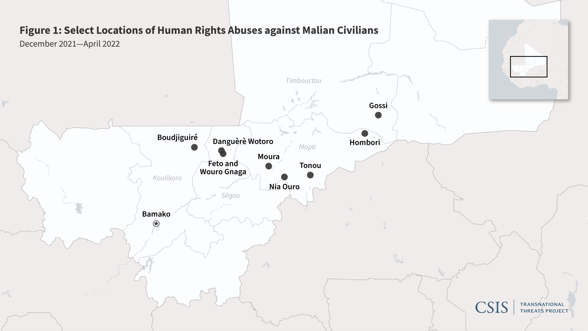 Although Wagner attempted to stage evidence of French atrocities at Gossi, it is the Russian contractors themselves that frequently commit such indiscriminate killings. Wagner is a Russian private military company (PMC) unofficially linked to the Russian government, including the Kremlin, Russian Ministry of Defense (particularly the Main Intelligence Directorate, or GRU), Federal Security Service (FSB), and Foreign Intelligence Service (SVR). Wagner deployed to Mali in December 2021 to train local forces and provide security services amid political instability and a growing Salafi-jihadist threat in the country. In exchange, Wagner has secured financial gains, including access to natural resources, and is able to pursue Moscow’s geopolitical goals. This model follows Wagner’s typical pattern of engagement in sub-Saharan Africa, where it has pursued partnerships with resource-rich states with weak governance in order to trade paramilitary, combat, intelligence, disinformation, and other security services for financial gain, most frequently through mining concessions, and to pursue Russian interests on the continent. The participation of Wagner troops adds a new dimension to the threat against civilians: Wagner itself has a long history of human rights abuses, and Moscow is unlikely to hold the new Malian government—with its own history of violence against civilians—accountable for its actions.