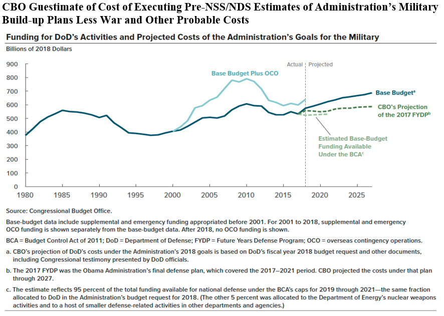 The CBO has not yet attempted to estimate the cost of the impact of the new NSS and NSD. There is no way it could. You cannot estimate the cost of good intentions. The CBO has, however, made a December 2017 guesstimate called the Analysis of the Long-Term Costs of the Administration’s Goals for the Military. This analysis is based on, "the Congressional Budget Office’s analysis of the costs and budgetary consequences through 2027 of the current Administration’s goals for increasing the readiness, size, and capabilities of the military. The report draws from the fiscal year 2018 budget request submitted by the Department of Defense (DoD) and from other official documents, including Congressional testimony presented by DoD officials."