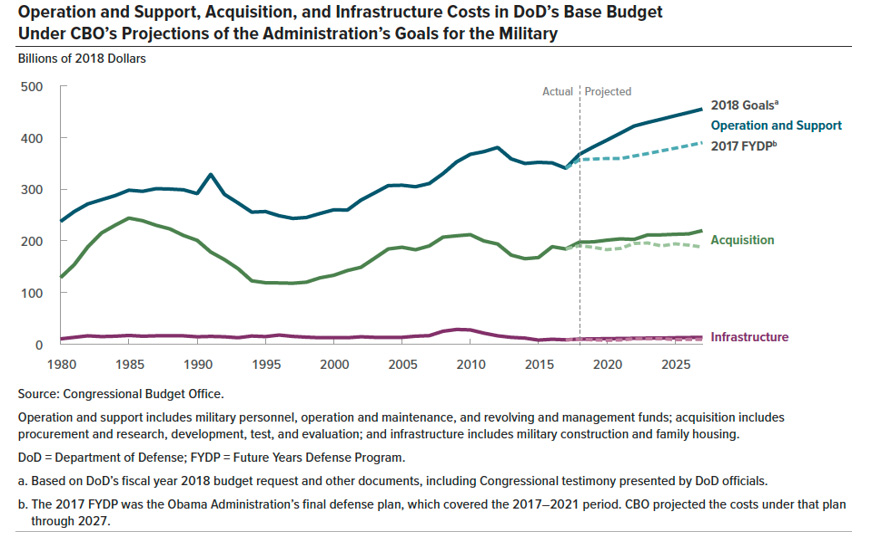 The CBO notes that, "the 2018 budget request calls for $640 billion in funding for the Department. Of that total, $575 billion would fund base-budget activities (such as day-to-day military and civilian operations and developing and procuring weapon systems) and $65 billion would fund overseas contingency operations (OCO, mostly for the conflicts in Afghanistan and in Iraq and Syria). The base-budget funding request is 3 percent more than the amount that would have been requested for 2018 under the Obama Administration’s final Future Years Defense Program, the 2017 FYDP, after adjusting for inflation."