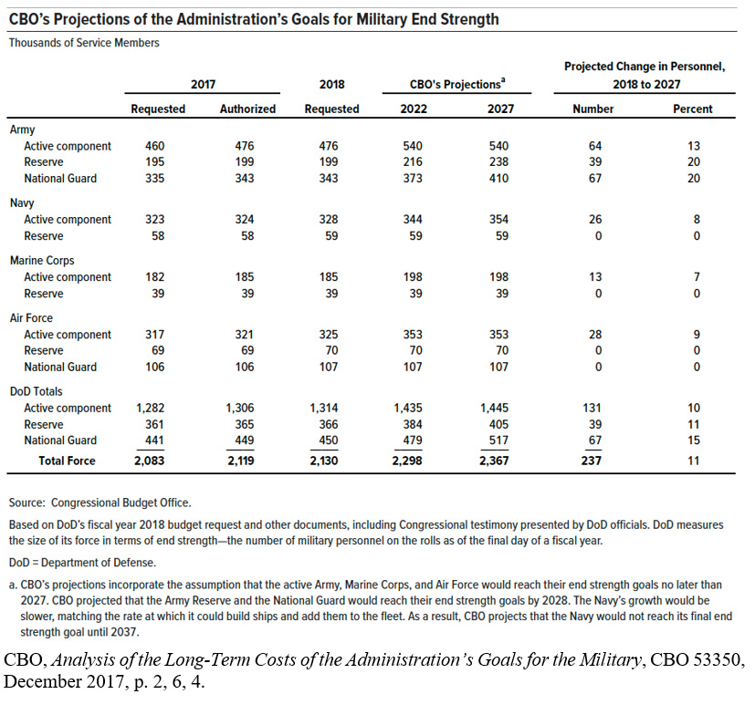 The CBO also addressed another key missing element in the NSS and NDS. It described the timeline for such a build-up: "growth in the number of service members that is consistent with current recruiting capacity and retention patterns. Under that plan, by 2022, the Marine Corps and Air Force would reach the goals described by their vice chiefs. The Army would reach its goal for the active component by 2022, but growth in the Army National Guard and Army Reserve would continue until 2028...The growth of the Navy’s fleet would be limited by shipyard capacity, reaching about 330 ships by 2027 and meeting the 355-ship goal in 2037...”