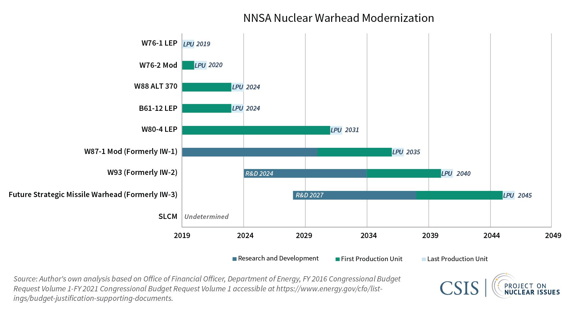 A1 : The Biden administration will face high-priority, high-profile decision points for nuclear modernization early this spring, and it will likely be contentious as stakeholders within and outside of government are already positioning publicly on a range of topics. Currently, there are ongoing efforts in the Department of Defense (DoD) and the National Nuclear Security Administration (NNSA) to modernize nearly every aspect of the U.S. nuclear arsenal over the next two decades. This includes all three legs of the nuclear triad and their associated delivery systems, an overhaul of the nuclear command and control architecture, the replacement of the air-launched cruise missile (ALCM) with the long-range stand-off weapon (LRSO), and a range of warhead modernization and refurbishment efforts. Additionally, NNSA plans to produce at least two new warheads for the stockpile: the W93 and the Future Strategic Missile Warhead.