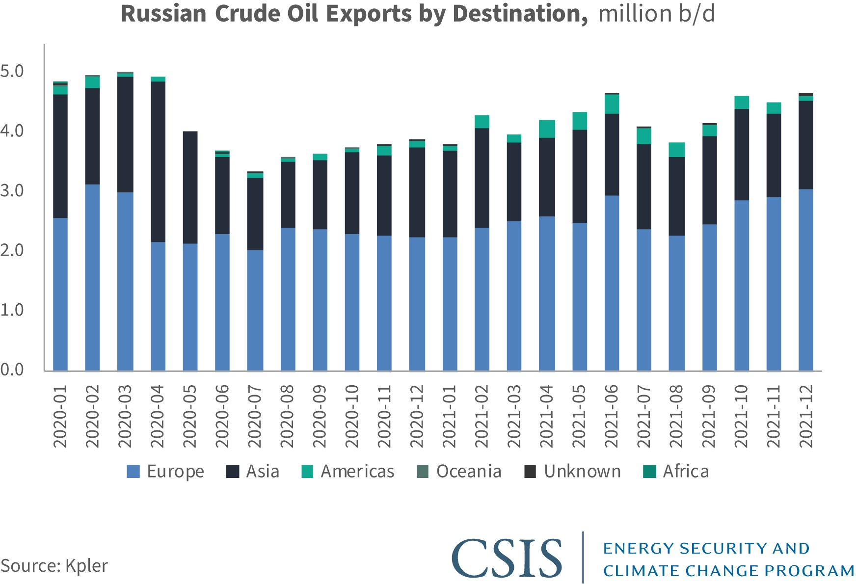 A1: Russia is one of the world’s three largest oil producers, along with the United States and Saudi Arabia, and plays a central role in OPEC+ (the Organization of the Petroleum Exporting Countries and allied producers). Russia’s December crude output was about 10 million barrels per day (b/d), and its total liquids production (including condensate, which is exempt from OPEC quotas) was nearly 10.9 million b/d. Russia exported about 4.3 million b/d in crude last year, equivalent to 4.5 percent of global demand, including 2.6 million b/d to Europe via pipeline and seaborne exports. It also exported about 1.6 million b/d in refined products to Europe. The Druzhba pipeline sends crude supplies to Belarus, Poland, and Germany through a northern arm and Slovakia, Hungary, and the Czech Republic through a southern arm that transits Ukraine. Russia also exported about 1.4 million b/d of crude oil to Asia in 2021, via the East Siberia Pacific Ocean (ESPO) pipeline system and waterborne exports. Russia’s exports to the United States have grown in the past three years, with crude and product exports reaching a monthly average of 705,000 b/d in the first 10 months of 2021. U.S. refineries import Russian crudes including Urals and ESPO blend as well as fuel oil and feedstocks for blending purposes.
