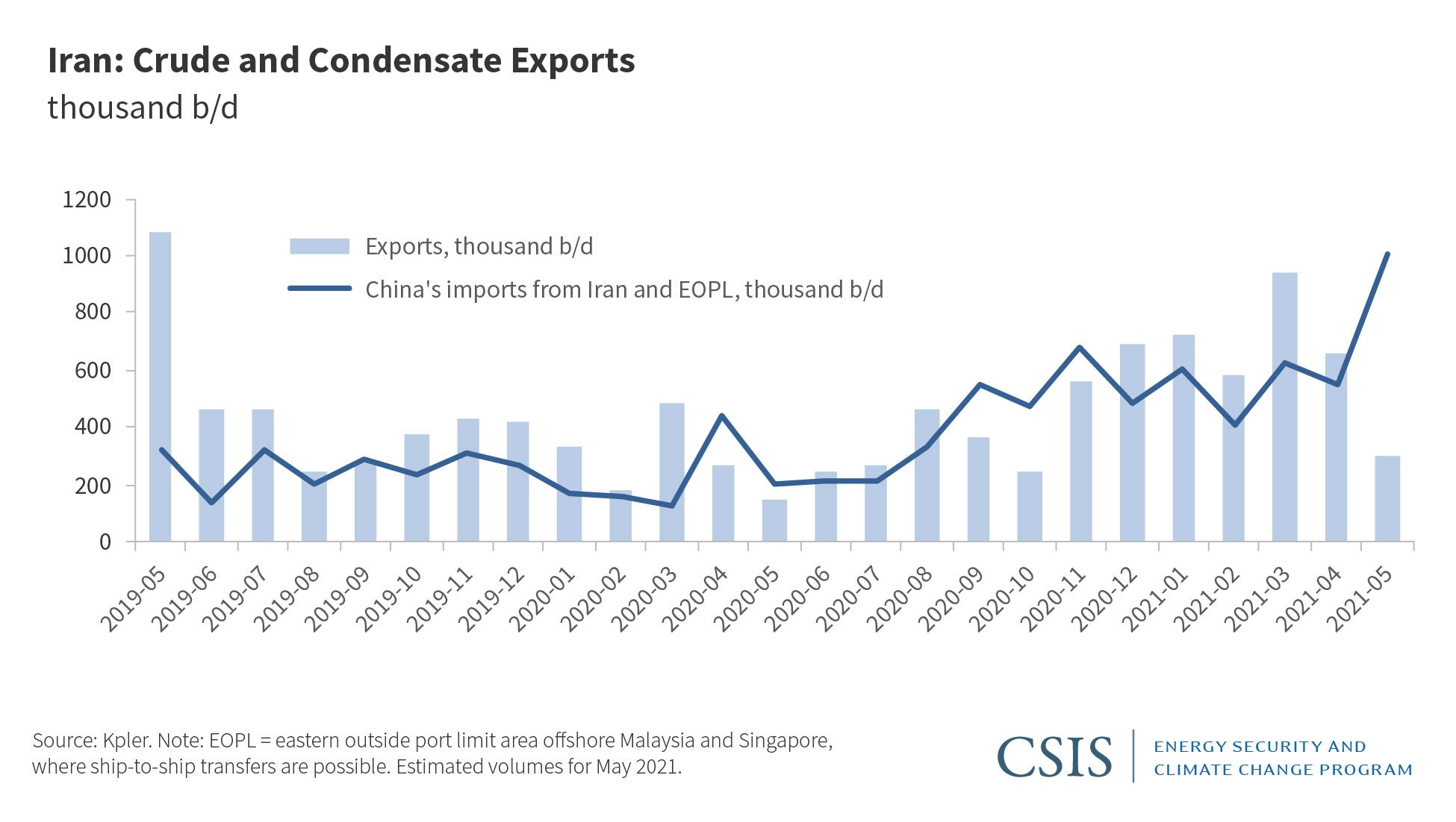 When the Trump administration withdrew from the JCPOA in May 2018 and reimposed sanctions on Iran six months later, Iran’s production and exports to Europe and Asia fell precipitously. Iran’s crude output dropped from 3.81 million barrels per day (b/d) in May 2018 to 2 million b/d by late 2019. Yet Iran has extensive experience in evading sanctions, and its output in recent months has been a subject of debate. Tankers carrying Iranian crude frequently turn off their transponders at sea, facilitating blending and ship-to-ship transfers that obfuscate the crude’s origin. Iranian barrels often show up in customs reports as imports from Malaysia, Indonesia, Oman, or other countries. Tanker trackers and firms using satellite imagery estimate that Iran has raised production and exports substantially this year. Kpler estimates that Iran’s crude and condensate exports in the first four months of this year averaged 727,000 b/d, compared with a trough of around 250,000 b/d after sanctions were reimposed in 2018 (see chart below). S&P Global Platts pegs Iran’s current crude and condensate exports at around 800,000 b/d. Iran also may have 65 million barrels of crude in floating storage, according to Citigroup estimates, in the expectation that it can quickly find a market for those barrels if sanctions are lifted.