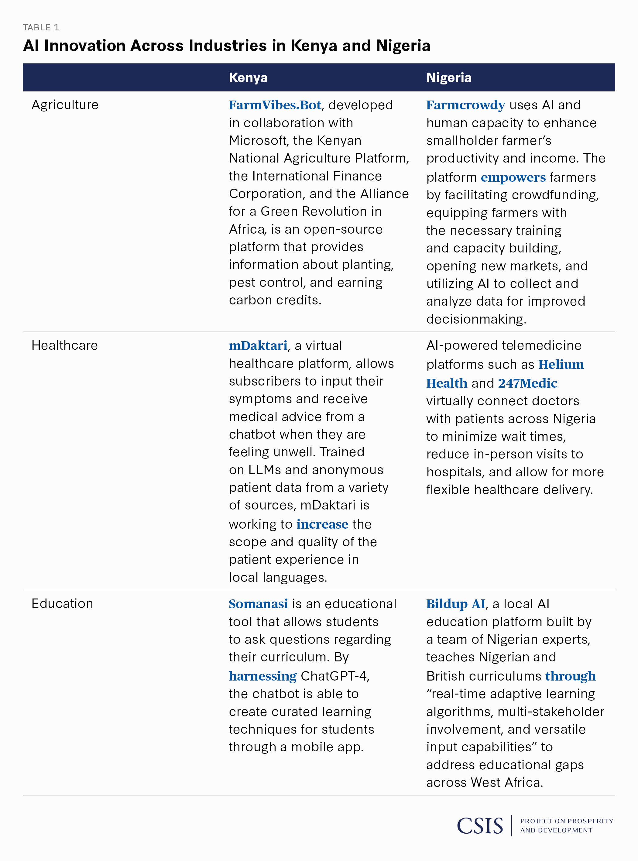 Kenya and Nigeria are becoming hubs of AI innovation geared toward agriculture, healthcare, and education. Through a mix of public-private partnerships, local innovation hubs, and the adoption of open-source AI models, Kenyan and Nigerian entrepreneurs are building AI solutions to address local challenges, as outlined in Table 1.1