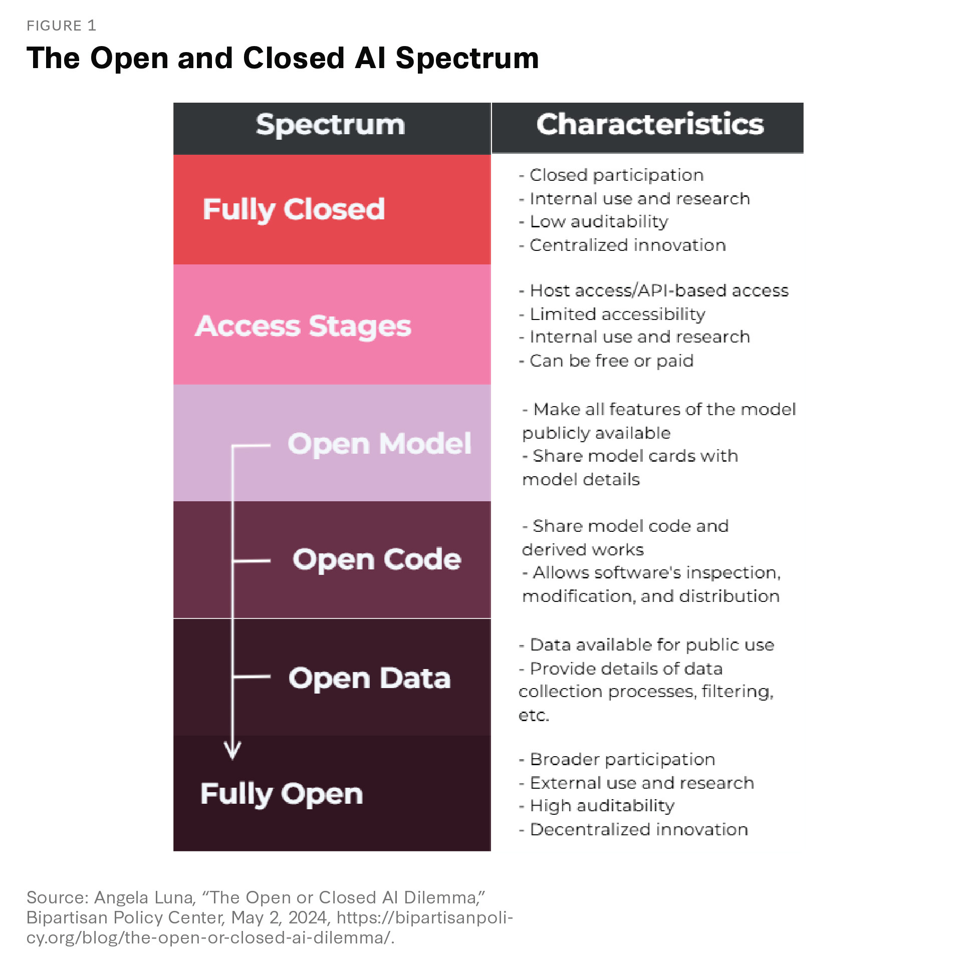 Often perceived as existing along a spectrum, open AI models can be systems that publish the complete model architecture, just the source code, or just the data. These models can be downloaded by anyone to be modified or built upon (with some restrictions). Open foundation platforms such as Llama and Mistral allow users to see, modify, and apply the models for their own needs. Inversely, closed systems do not make their design public, and users only interact with the model’s interface. For example, one could ask OpenAI’s ChatGPT to draft a paper of a specified length on the impact that AI could have in developing countries. ChatGPT would write it, and although the user could see the sources from which information was gathered, they would not be able to see the code the model used nor the data with which that model was trained to come to the assumptions that undergird the paper.