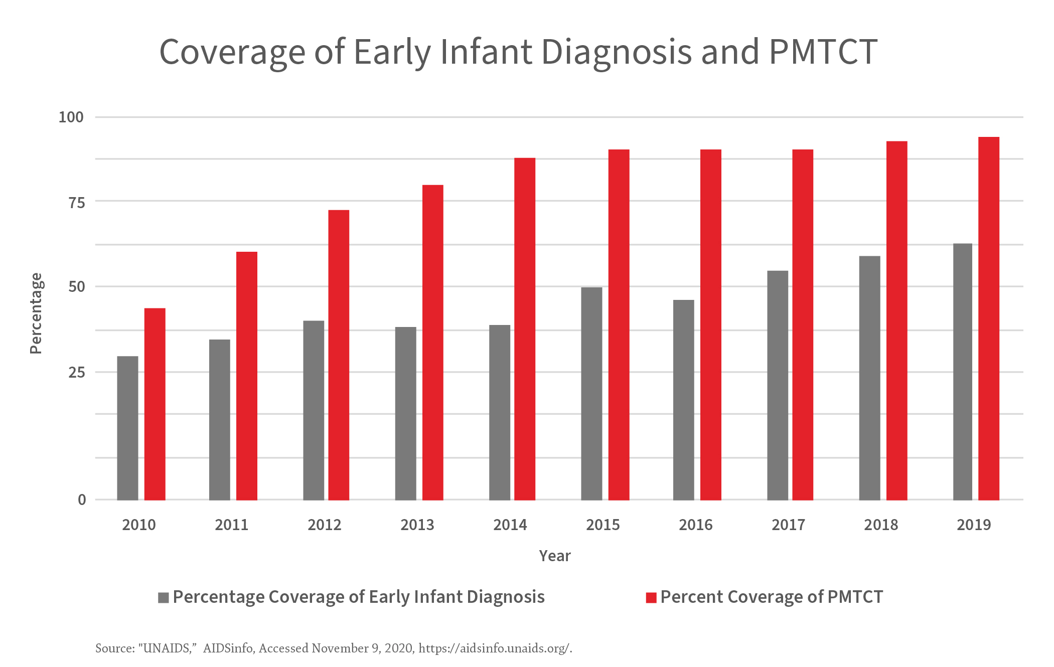 The 2016-2021 UNAIDS strategy, On the Fast-Track to end AIDS, notes that despite good progress between 2000 and 2014 in decreasing the number of children acquiring HIV each year, there was still “deplorably low treatment coverage for children living with HIV,” underscoring persistent challenges in effectively testing infants and initiating them on treatment. For 2020, Target 2 envisioned “Zero new HIV infections among children and mothers are alive and well.” The recent strategy has emphasized the importance of EID services for all children exposed to HIV and draws special attention to children’s experience of stigma and discrimination. Prioritizing continued progress towards eliminating HIV infections in children in the post-2021 period will help sustain global focus on the needs of this uniquely vulnerable population.