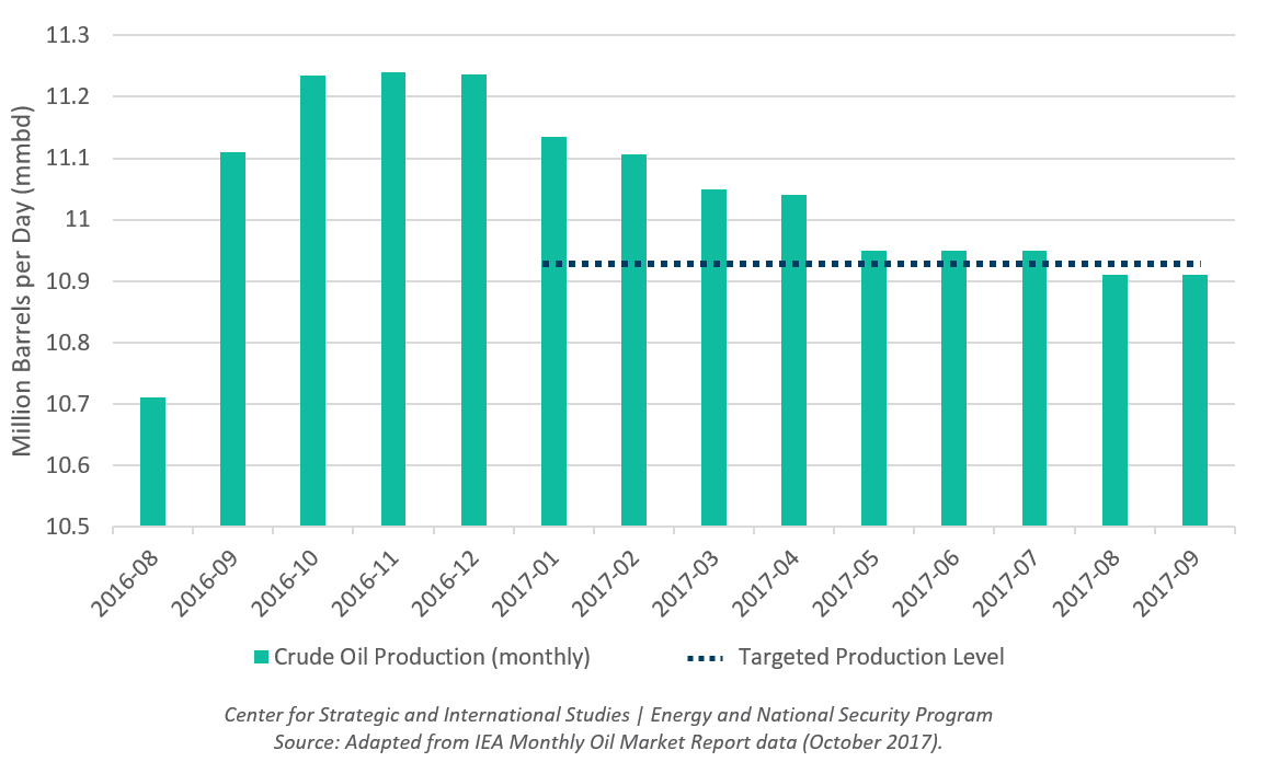 In December 2016, OPEC joined with a group of non-OPEC countries and set out to curtail crude oil output by 1.8 million barrels per day (mmbd) in a bid to rebalance the global oil market. The agreement marked a demonstrable change in tactics on the part of both Saudi Arabia and Russia, the leaders of the two groups. Saudi Arabia departed from its original plan to increase market share to reduce the impact of U.S. shale production. For its part, Russia agreed to join the production cuts even though just two years earlier it openly questioned the relevance of OPEC in the age of quick-cycle shale oil. While the agreement did not explicitly state an intended numerical price target upon its announcement (other than 1.8 mmbd curtailment), secretary general of OPEC Mohammad Barkindo offered some clarity at CSIS in December 2016 by stating that an unofficial quote of $60 oil had been used as an internal incentive within the group to garner supply restriction commitments. Additional clarity was offered in May 2017 upon the extension of the deal for another nine months, when Saudi oil minister Khalid Al-Falih stated that the intended target was to reduce global petroleum stocks to their five-year average.