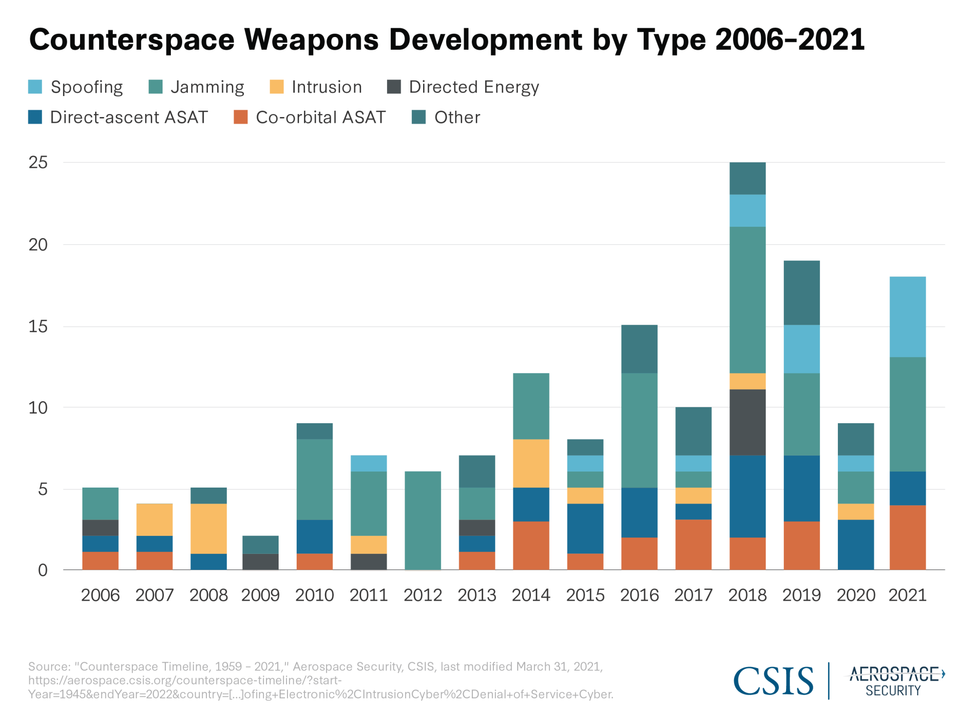 A2: The use of counterspace weapons, particularly non-kinetic or electronic weapons, in conflict are becoming increasingly commonplace. Jamming and spoofing of communications or positioning, navigation, and timing (PNT) signals like GPS are proliferating among state and non-state actors. With 2020 as an exception, likely due to the Covid-19 pandemic, CSIS has observed a relative increase in the development, testing, and deployment of counterspace weapons over the past 15 years. These weapons can target satellites on orbit, satellite ground components, or the links between them. China and Russia are by far the most active and advanced.